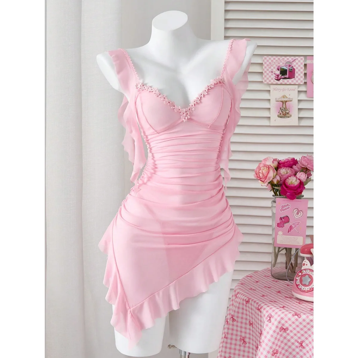 2026 Cross-Border Pure Desire Style Ruffled Women's Lingerie Sheer Mesh Backless Strapless Padded Bodycon Dress