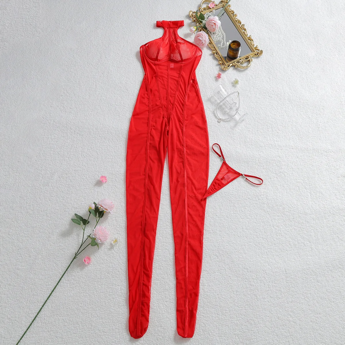 2026 European American Fashion New Arrival Black Sheer Polyester Bodycon Shaping Sexy Halter-Neck Jumpsuit Machine Embroidery