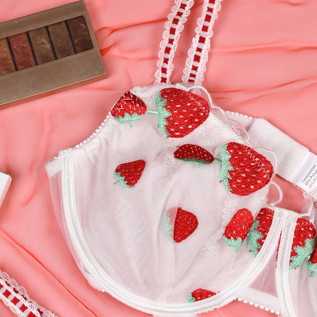 2026 New Arrival Cross-Border Lace Embroidered Strawberry Pattern Women's Bra Sheer Mesh Spandex/Polyester Red White Ribbon Sexy