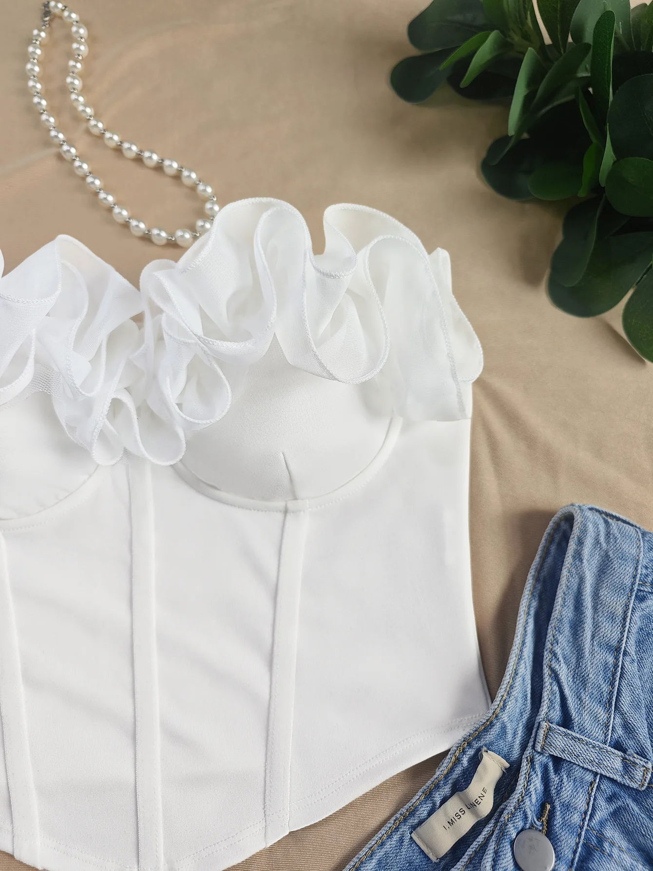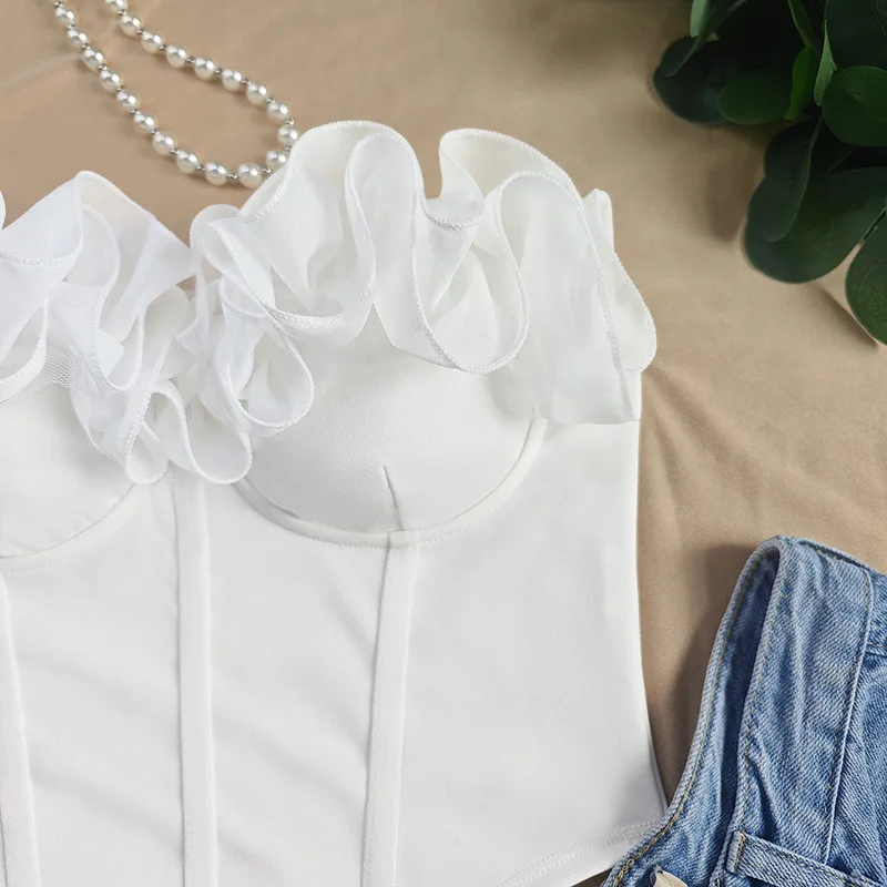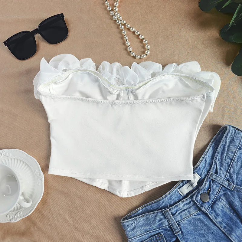 2026 New Sweet White Petal-Edged Sexy Halter Neck French Vintage Ruffled Overlay Top for Layering, Slimming Strapless Blouse