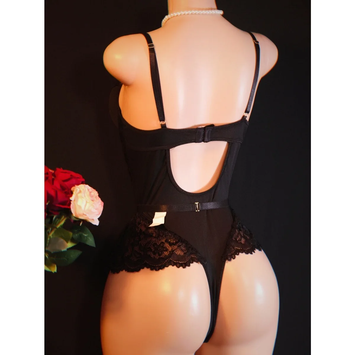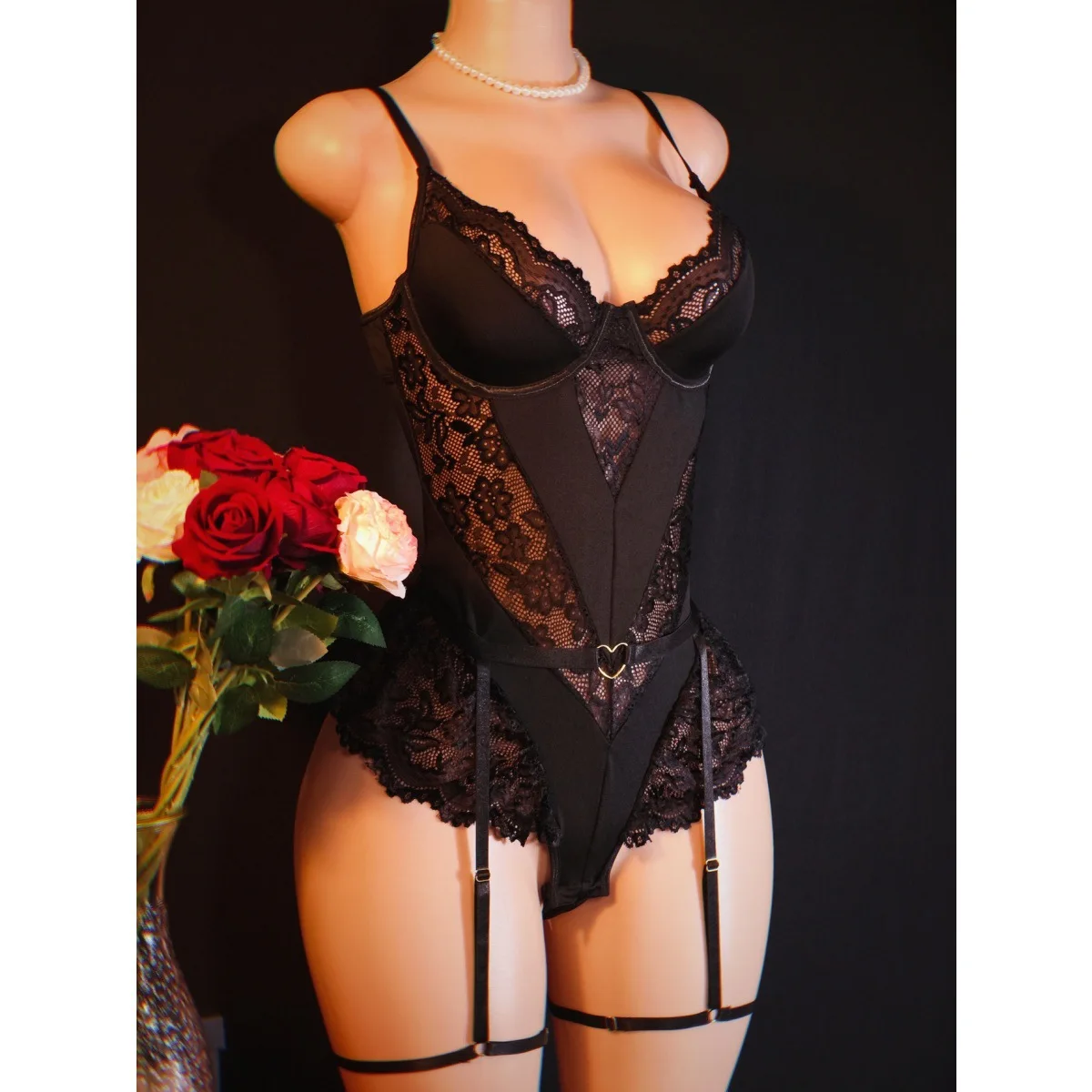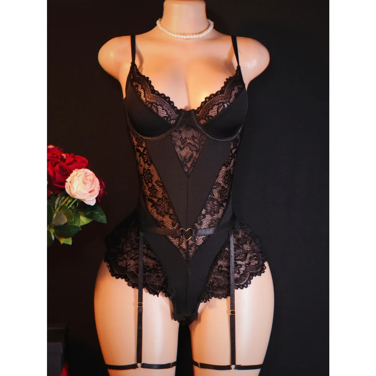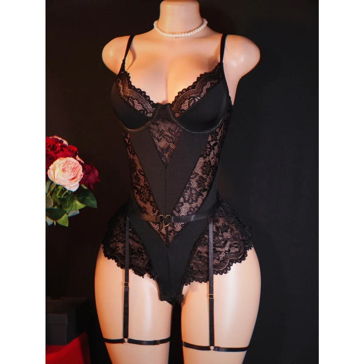 2026 New Arrival Cross-Border Lace Sexy Fitted Corset Lingerie for Women Mesh Panel Deep V-Neck Sheer Bodysuit