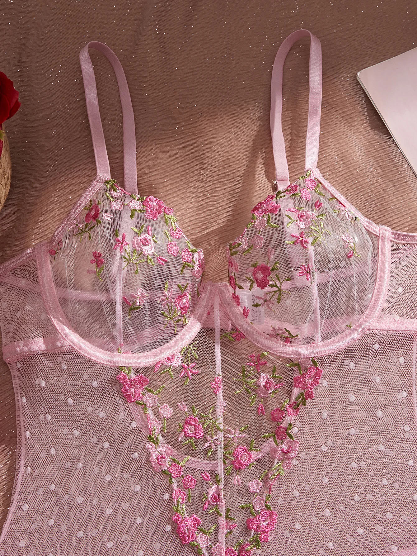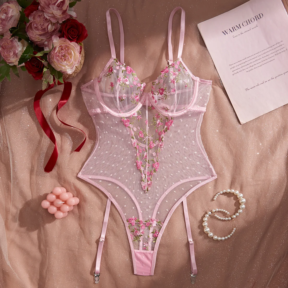 2026 New Arrival Cross-Border Sexy Lingerie: Sheer Lace Floral Embroidered Pink Bodysuit for Women