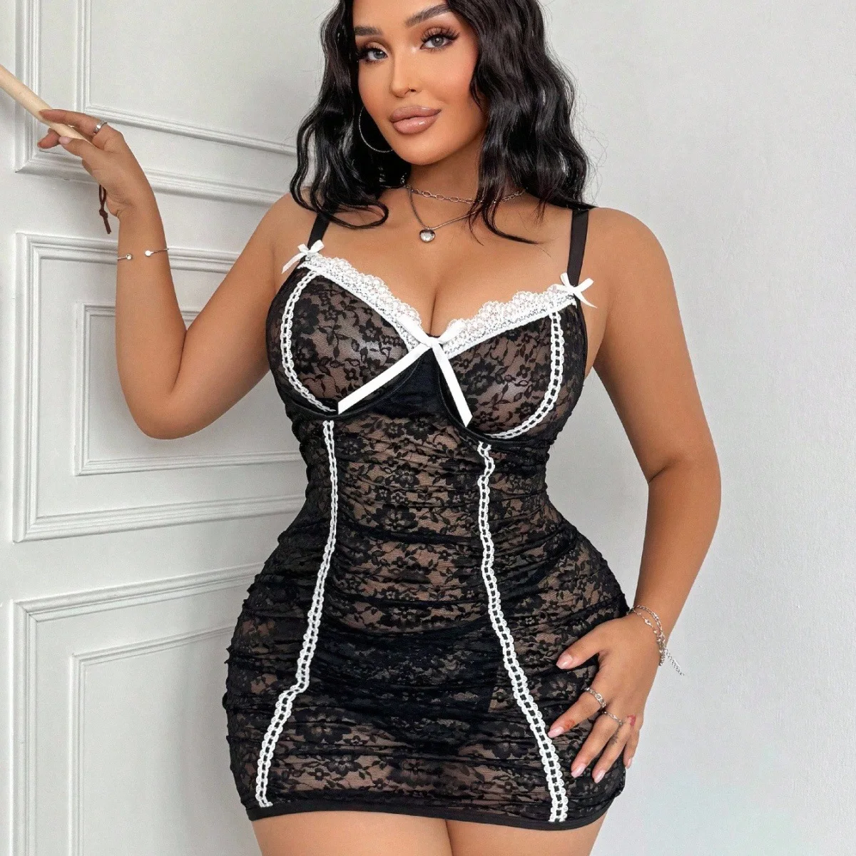 New Arrival Hot Seller Women's Plus Size Sexy Nightgown Set Black Romantic Lace Patchwork Design Adjustable Straps