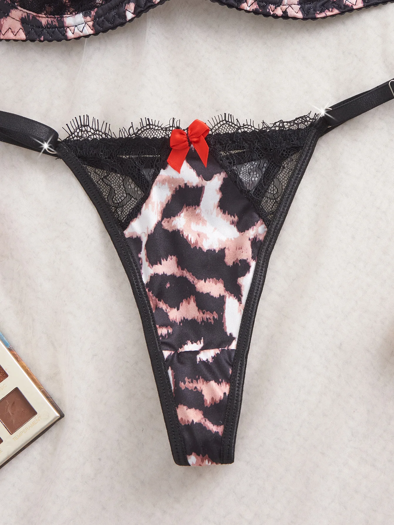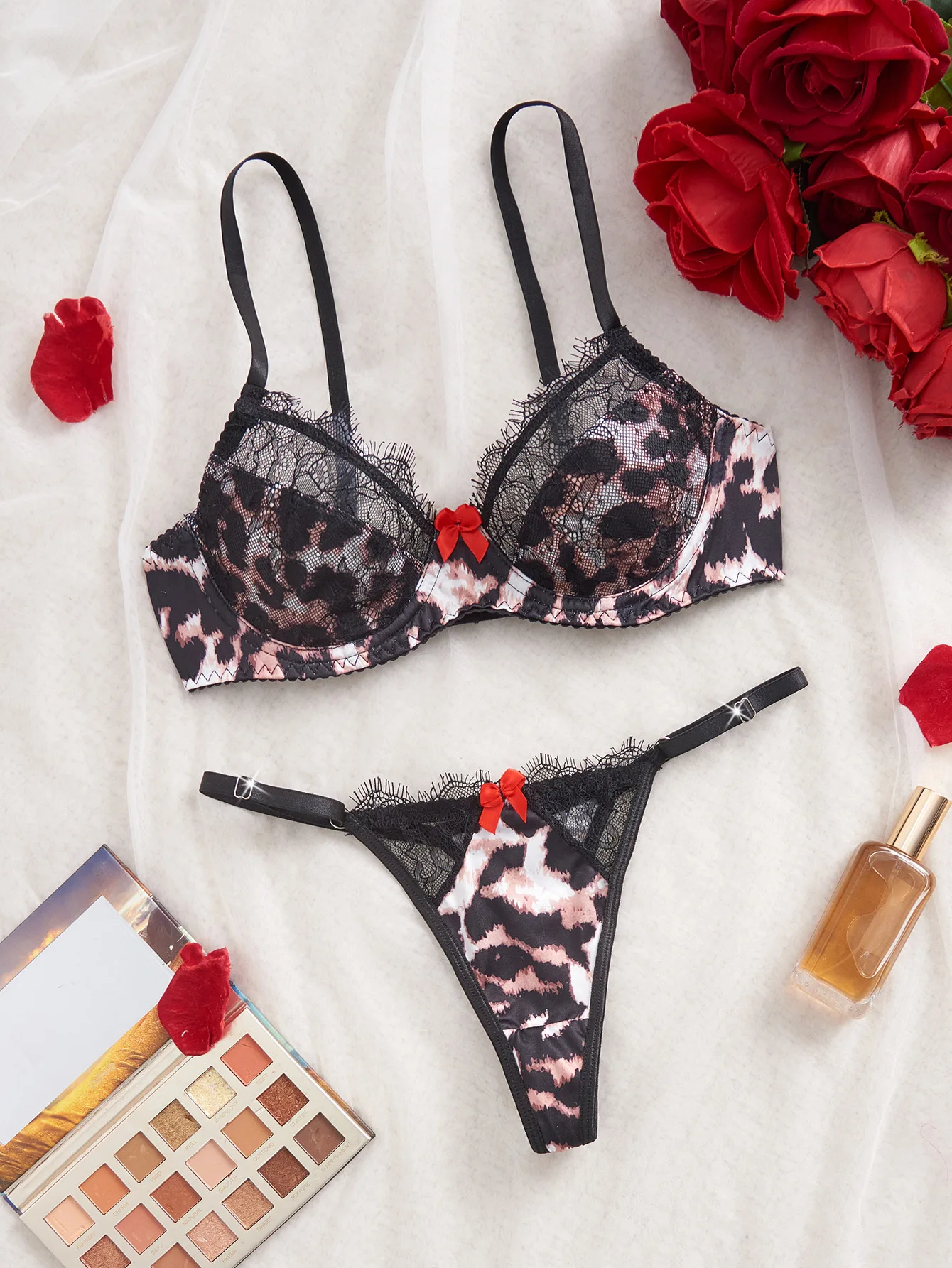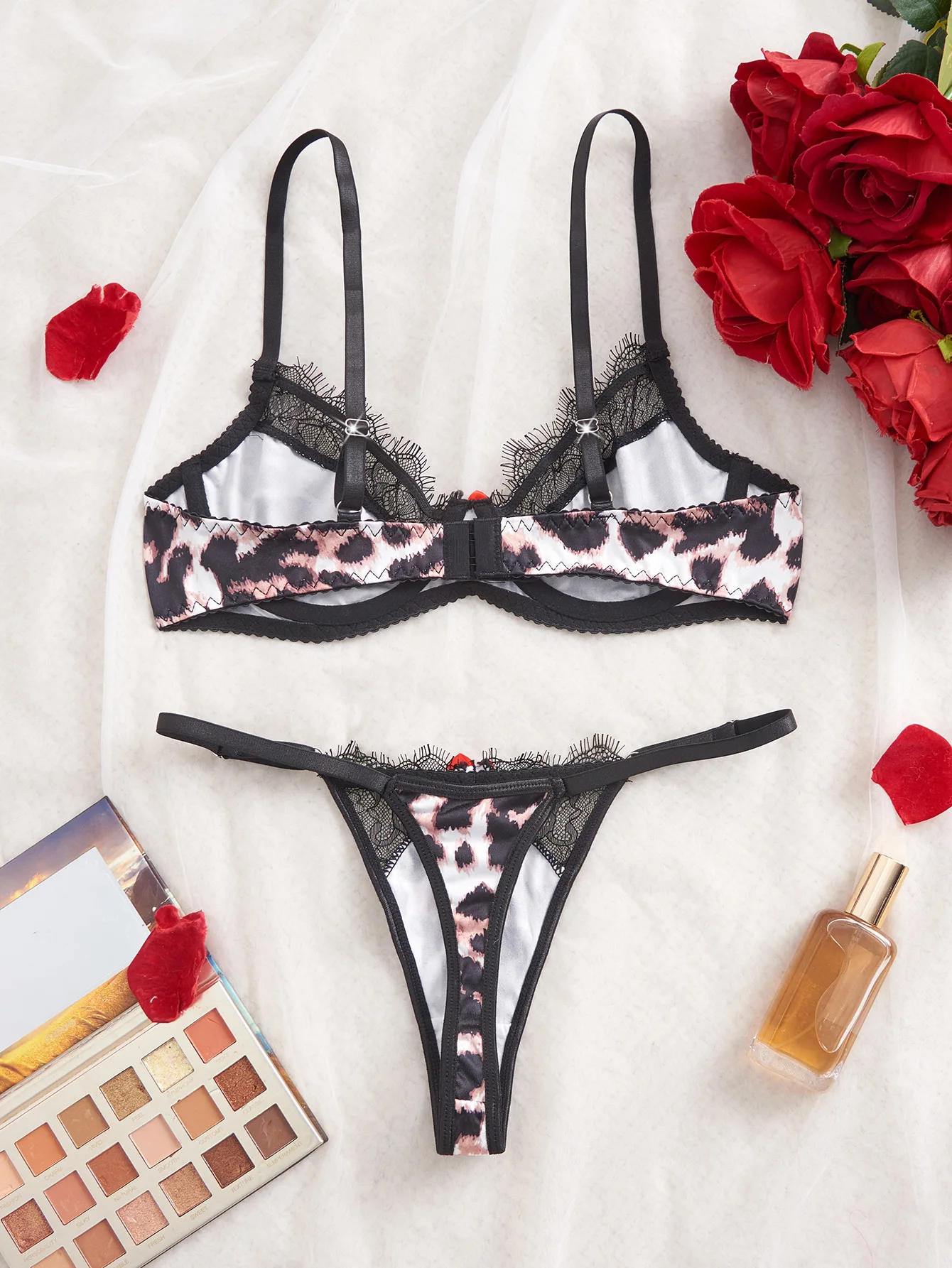2026 New Arrival Cross-Border Sexy Lingerie Lace Leopard Print Patchwork Underwire Push-Up Lightweight Breathable Bra Set