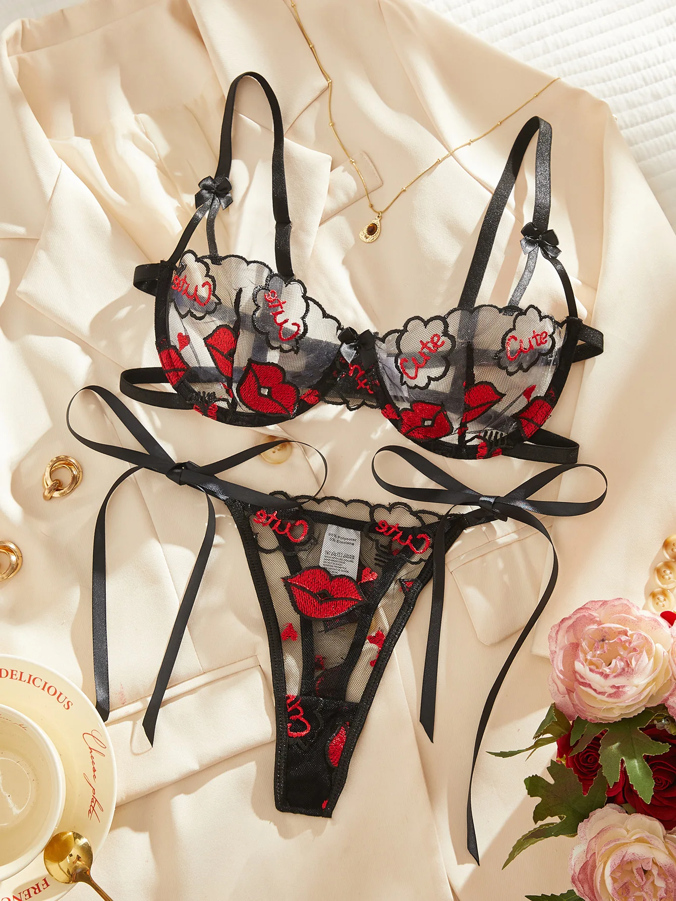 2026 New Arrival Cross-Border Lingerie Set: Sheer Mesh Sexy Lips Embroidered Thong with Straps & Pure Desire Bra