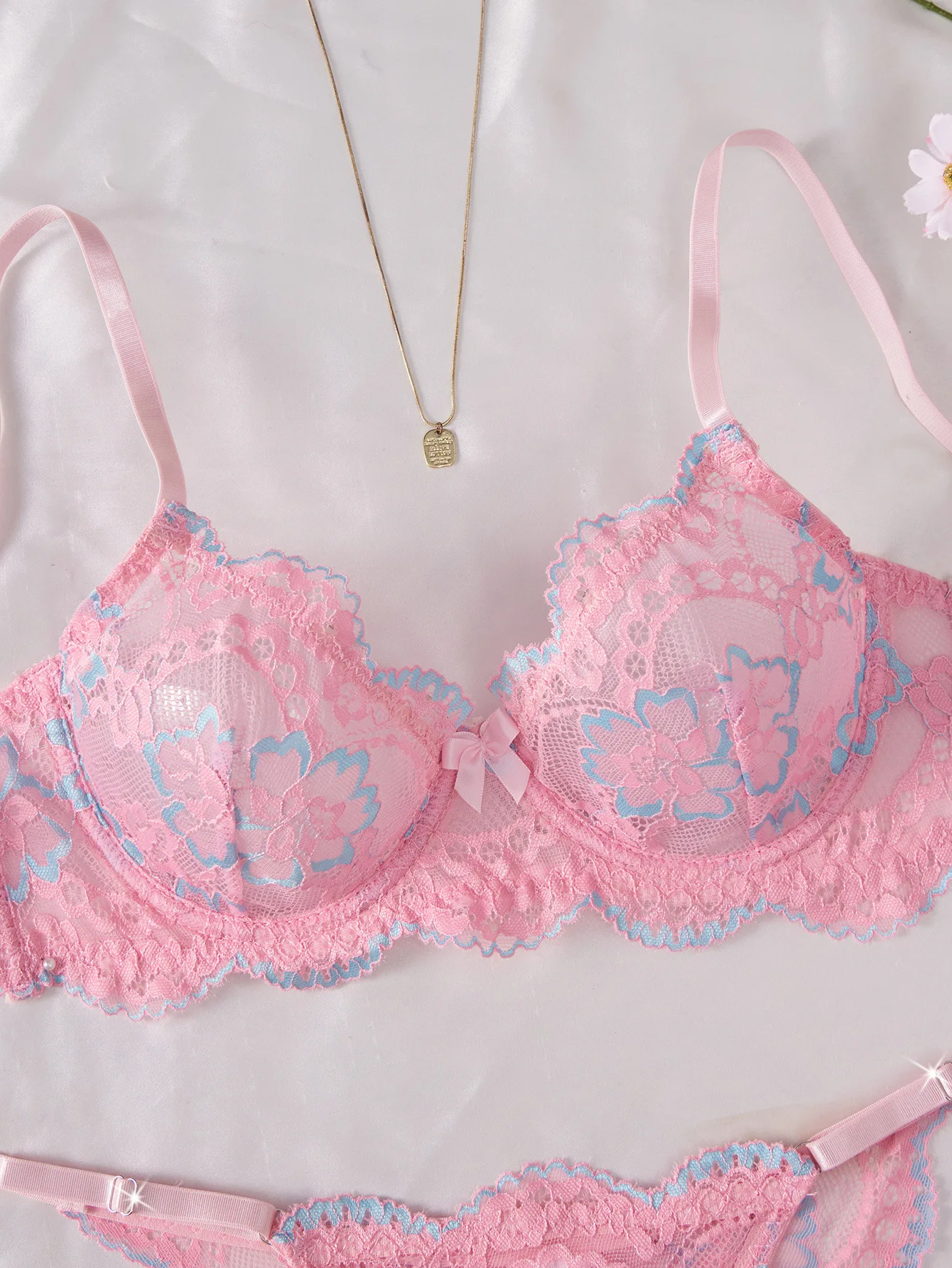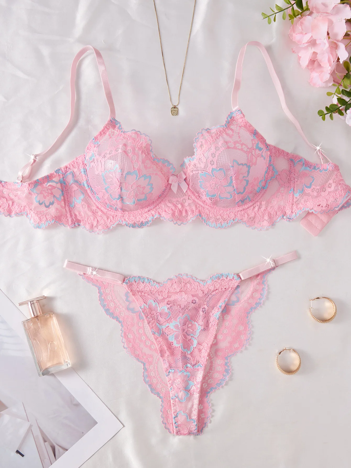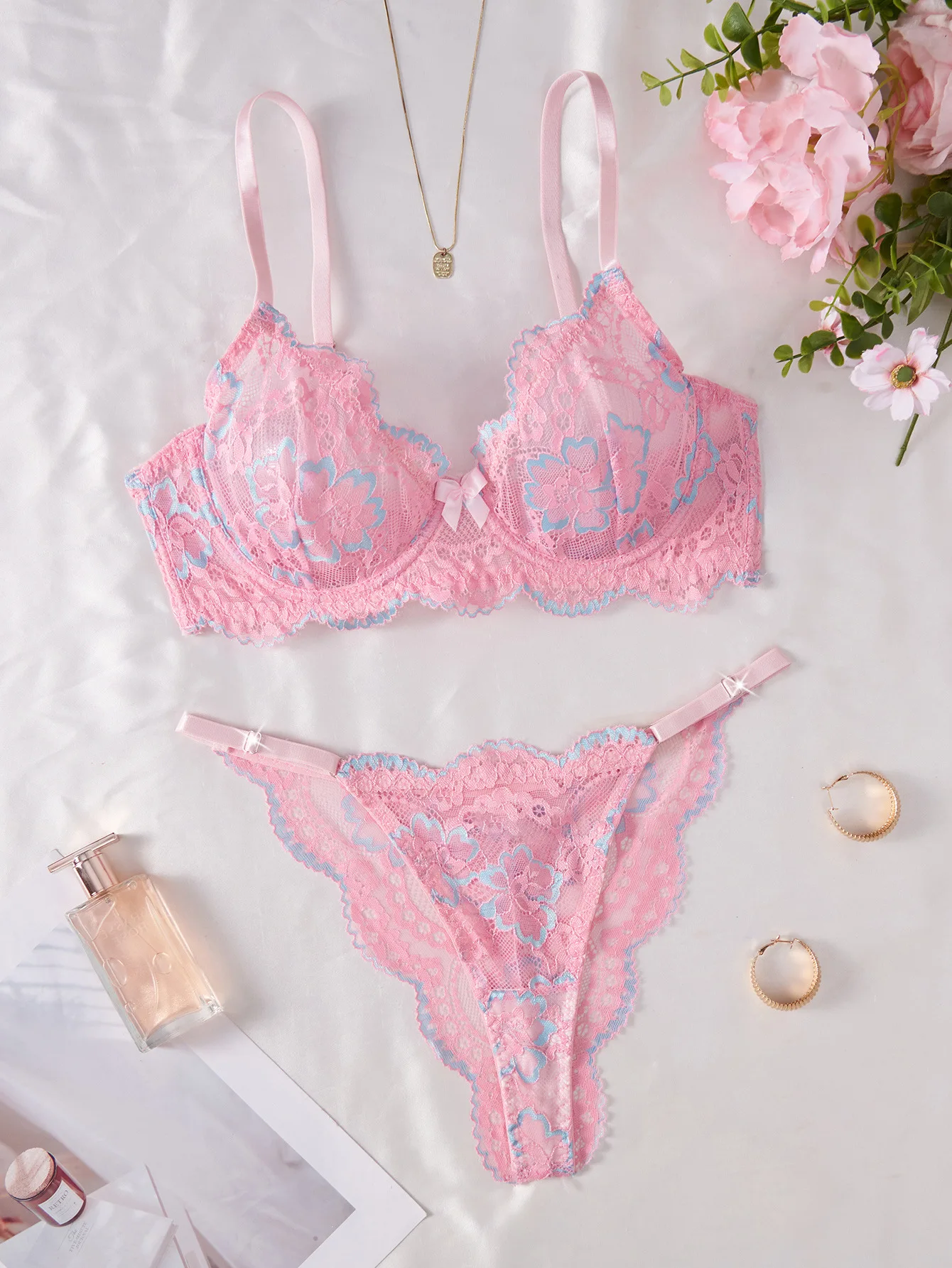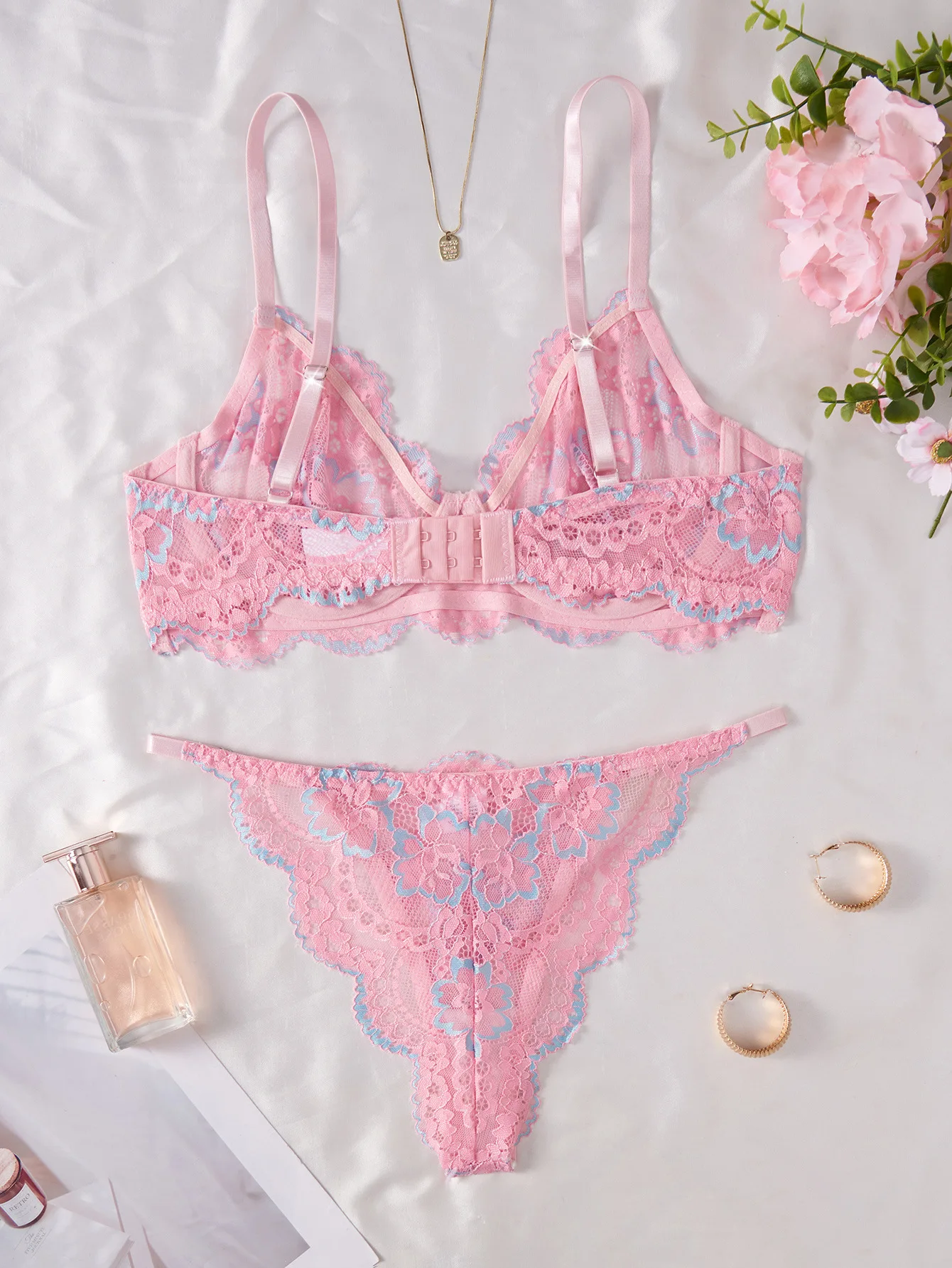 2026 Cross-Border European & American Style Sexy Lingerie Pink Lace Print Sweet Pure Desire Bra Set for Women