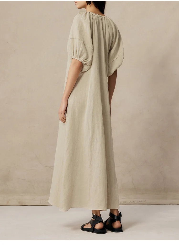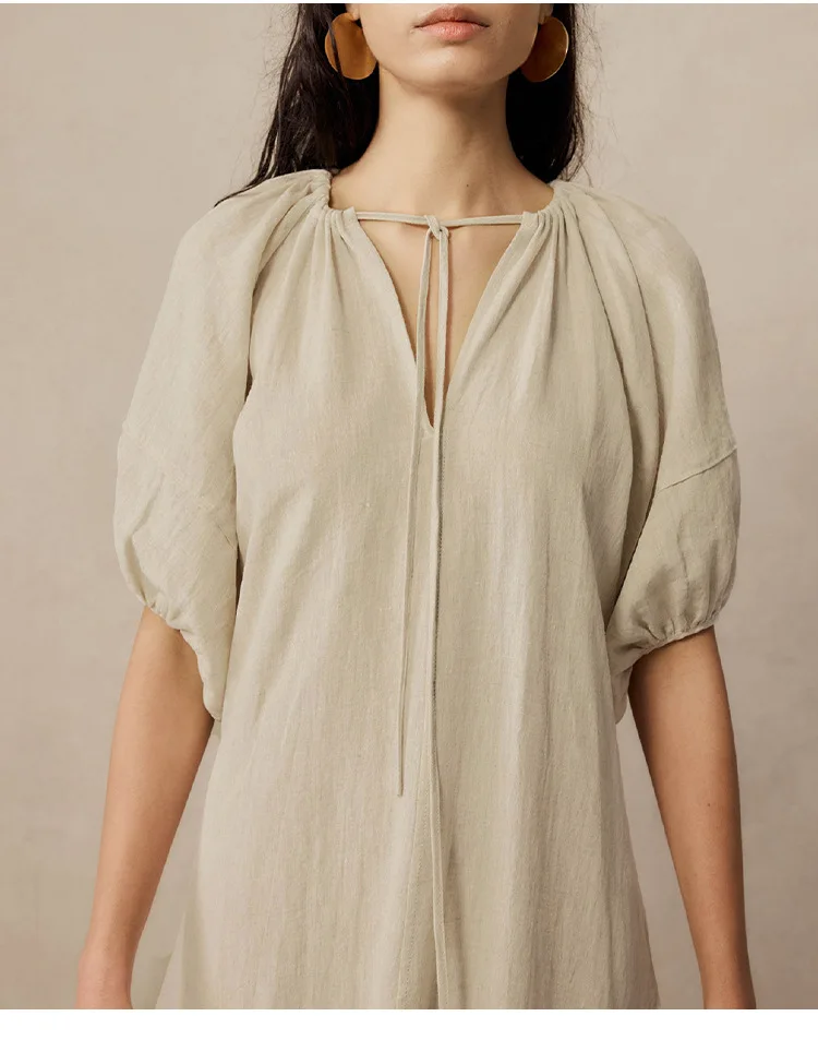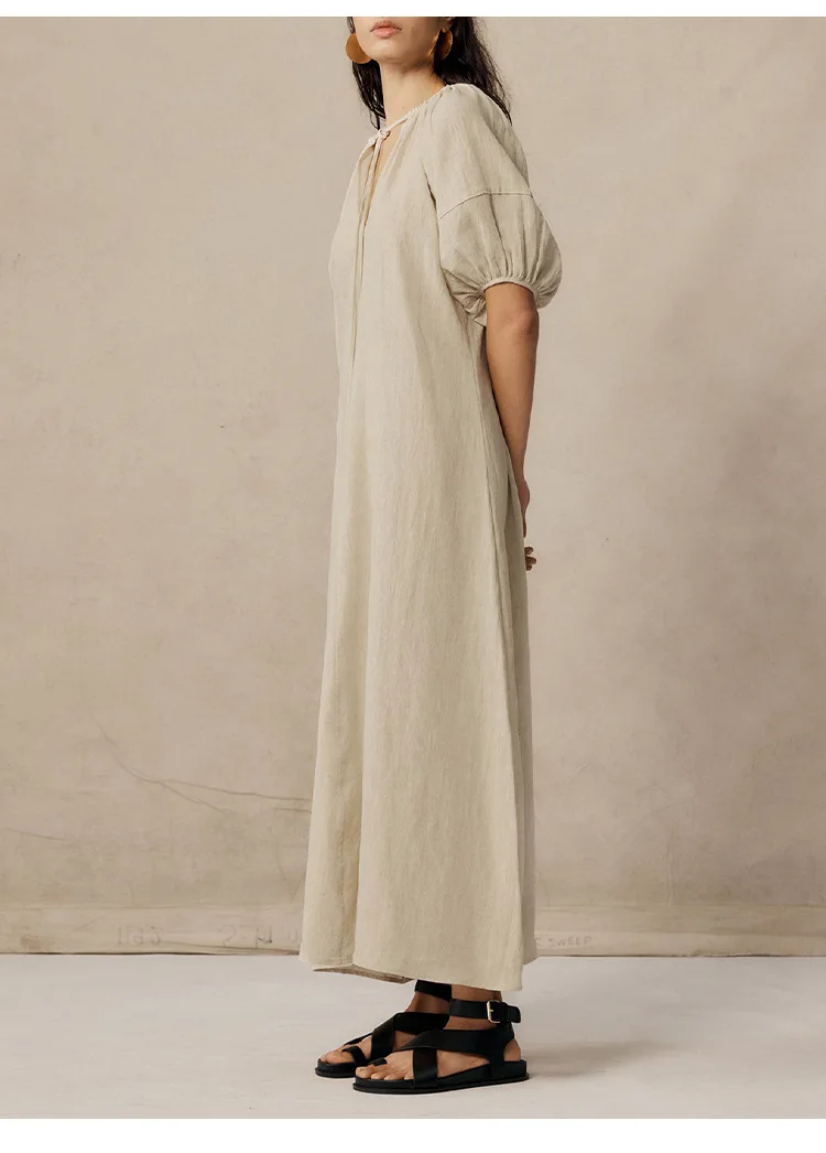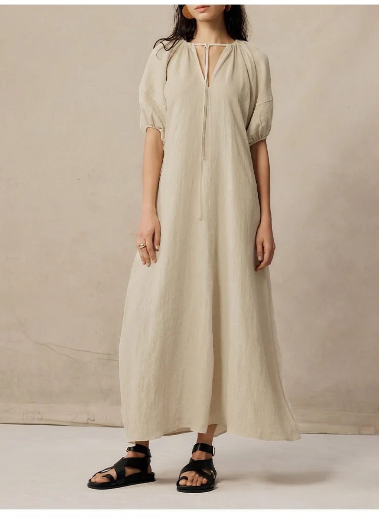 European and American Cotton and Linen V-neck Dress with Lace-up Casual Comfortable and Elegant Dress