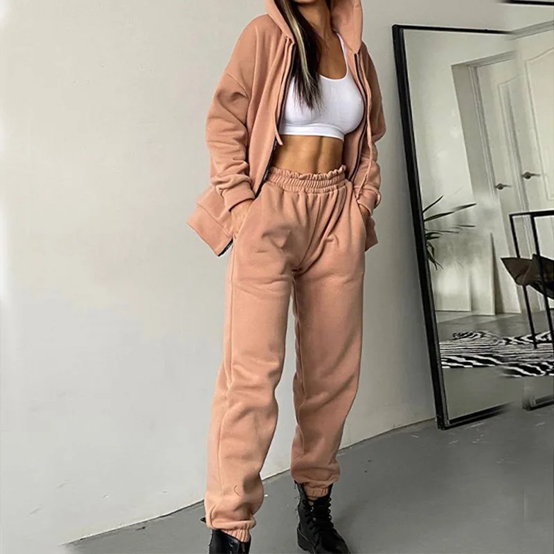 Wholesale Custom Women Fleece Tracksuit Sweatsuit Full Wool pink Crop Top Short Full Zip Hoodie Pants Jogger Clothes Set