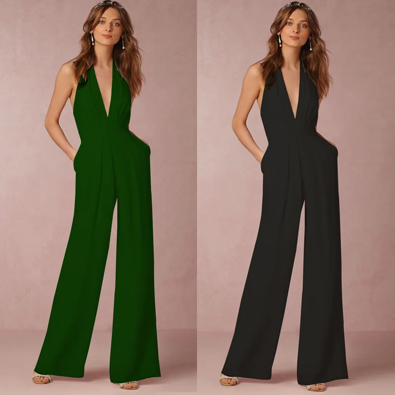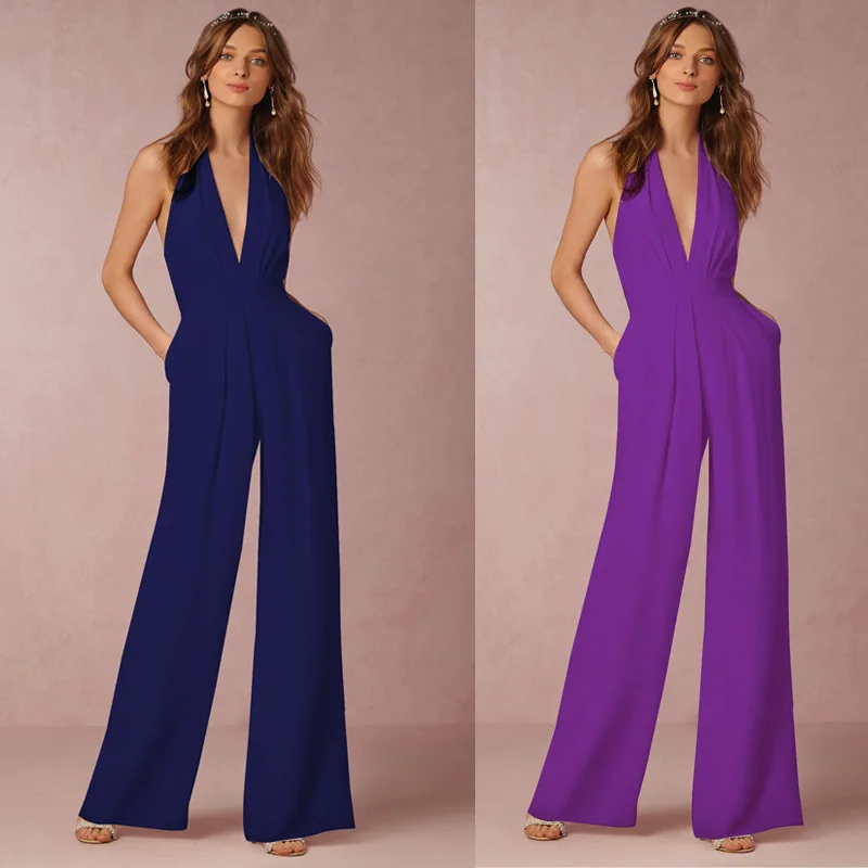 Custom Sexy Backless Jumpsuits Romper Women Long V-neck Sleeveless Bodycon Jumpsuit Party Elegant Wide Leg Pant Body Femme