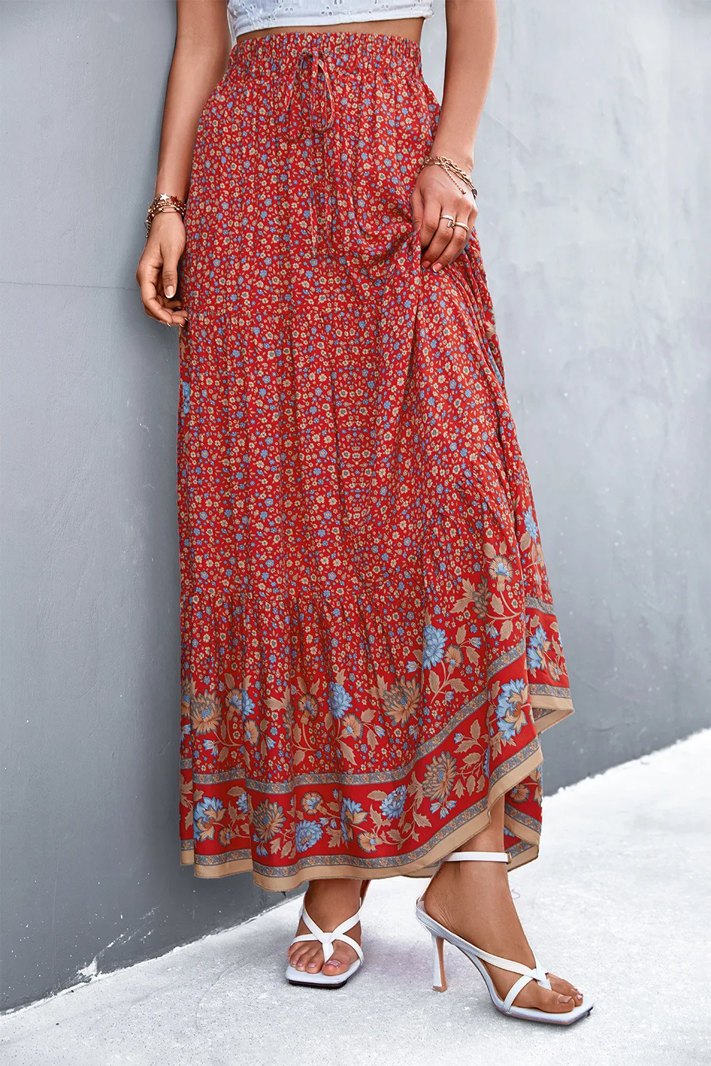Women Hot Seller a Line High Waisted Floral Print Skirt Ladies Bohemia Style Floral Print Maxi Skirt