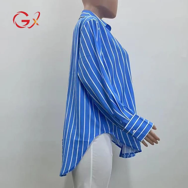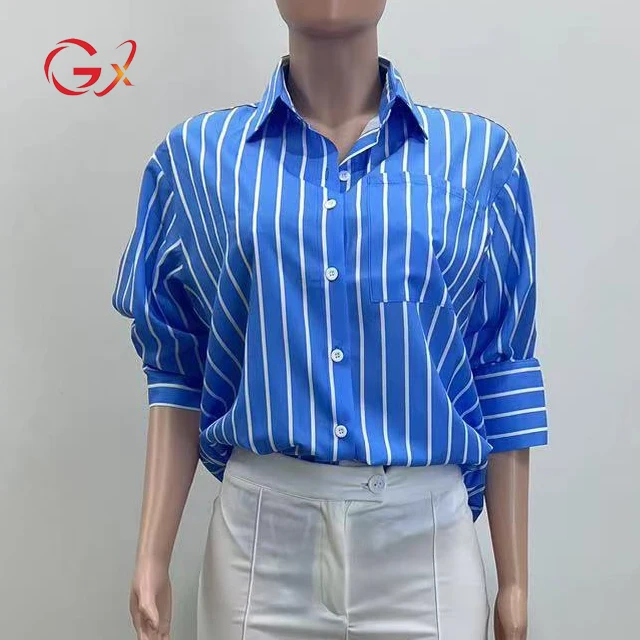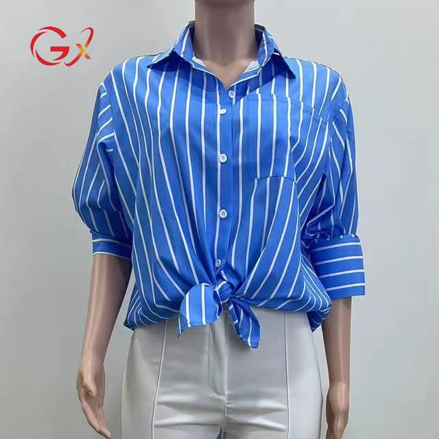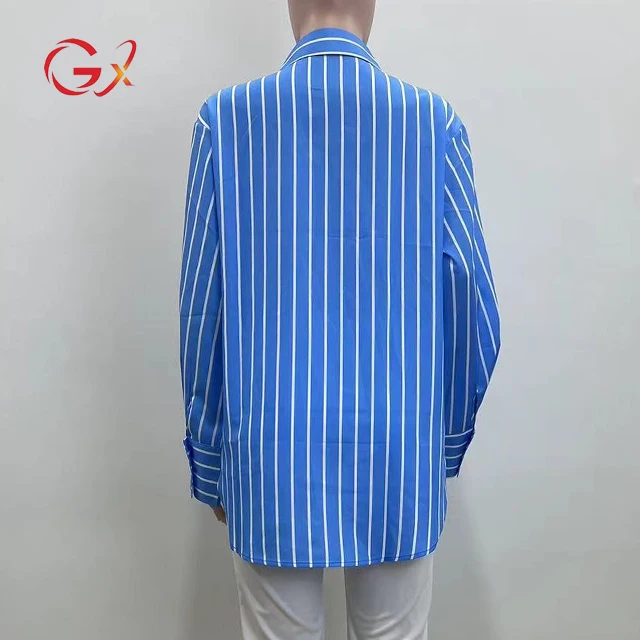 GX6021 Fashion Elegant Spring Fall Blue Strip Blouse Print Loose Single Breasted Cardigan Polo Collar Long Sleeve Shirt Women