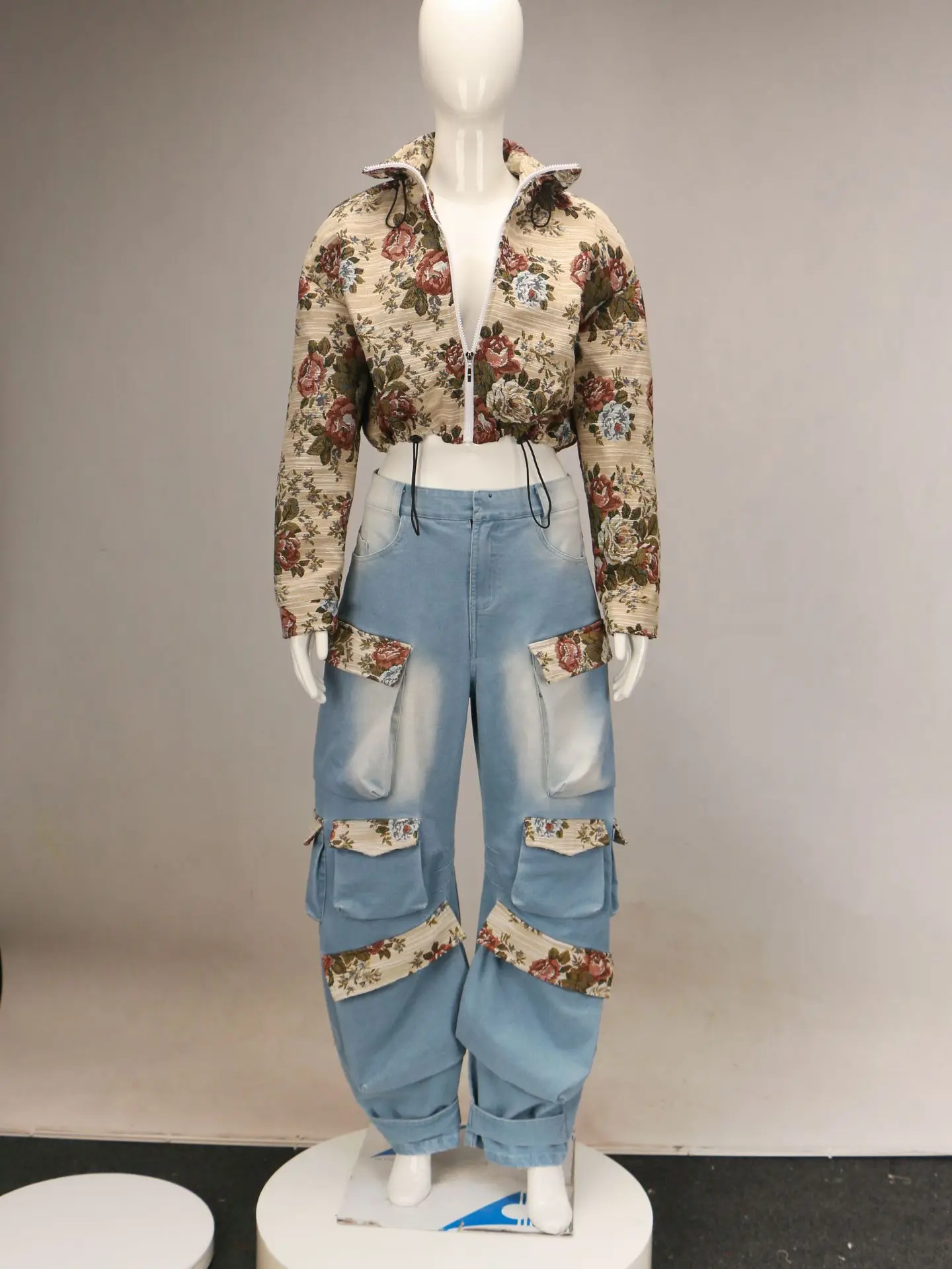 GX25022 Fashion Women Clothes Vendor Denim Street Wear Long Sleeve Unique Print Cropped Jacket and Denim Cargo Pant 2 Piece Set