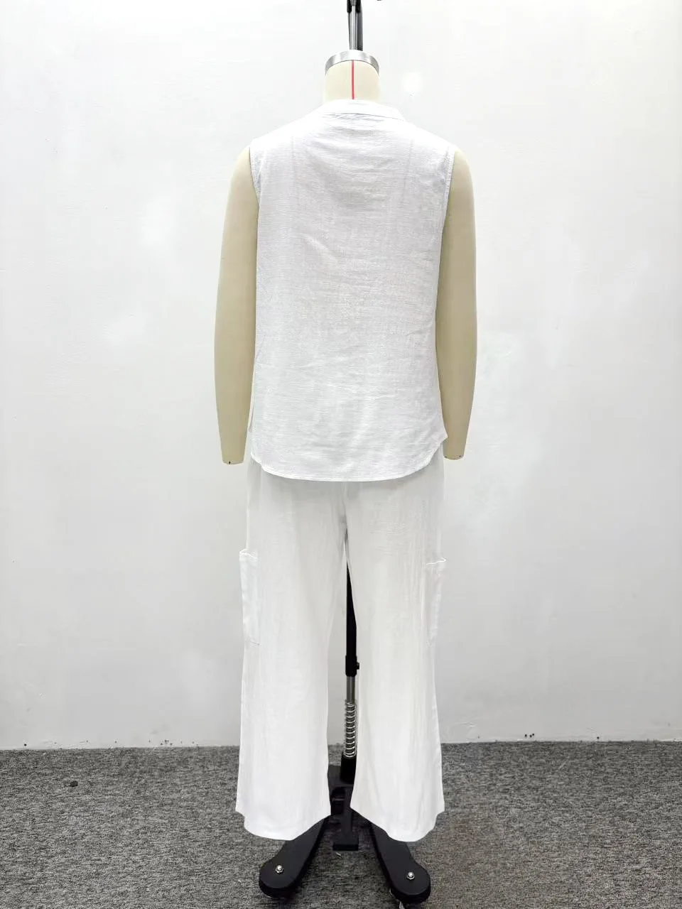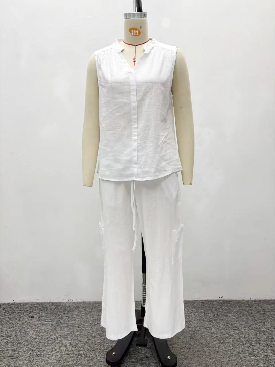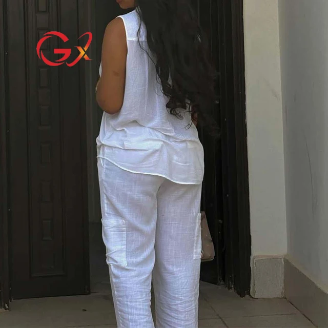 GX7403 Wholesale Summer Elegant Women Boutique Casual Street Wear Sleeveless V-Neck Shirt and Wide Leg Pant 2 Piece Set