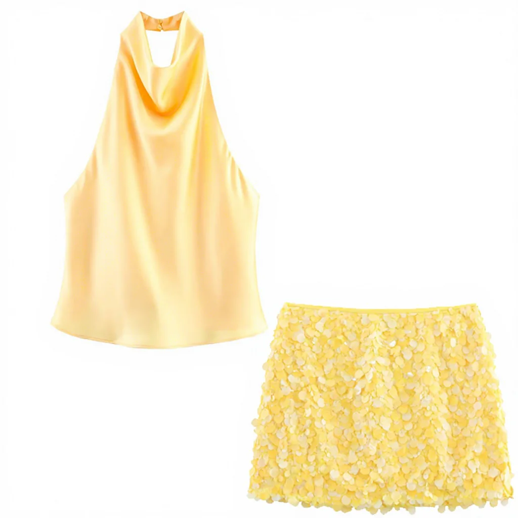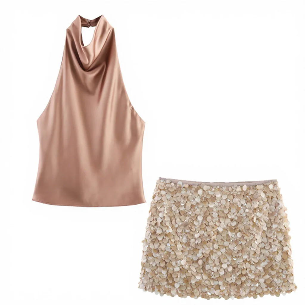 GX1435 Fashion Summer Sexy Clothing Boutique Street Wear Women Halter Satin Tops and Sequin Mini Skirt 2 Piece Set