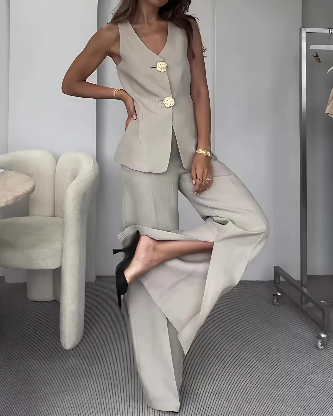 GX528 Boutique Fashion 2026 Fall Women Street Wear Sleeveless V-Neck Button Tops and Wide Leg Split Pant 2 Piece Set