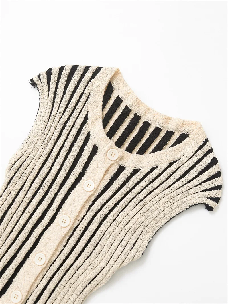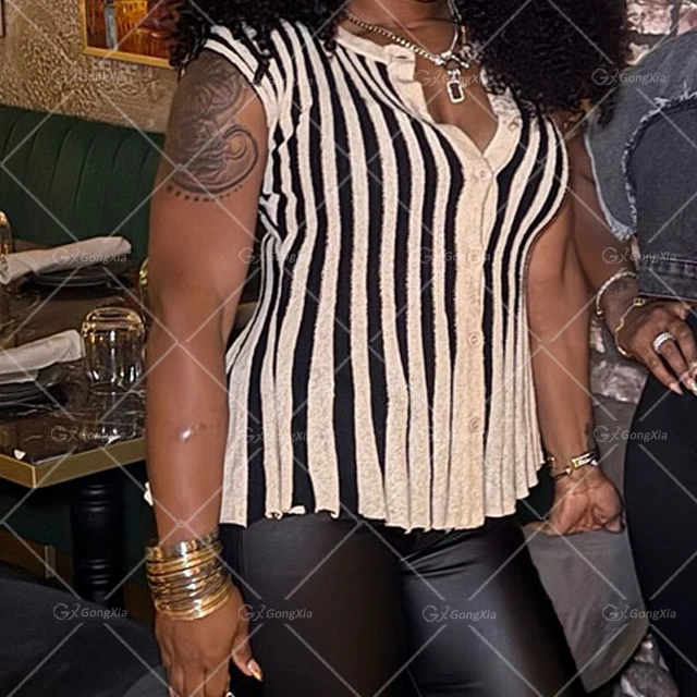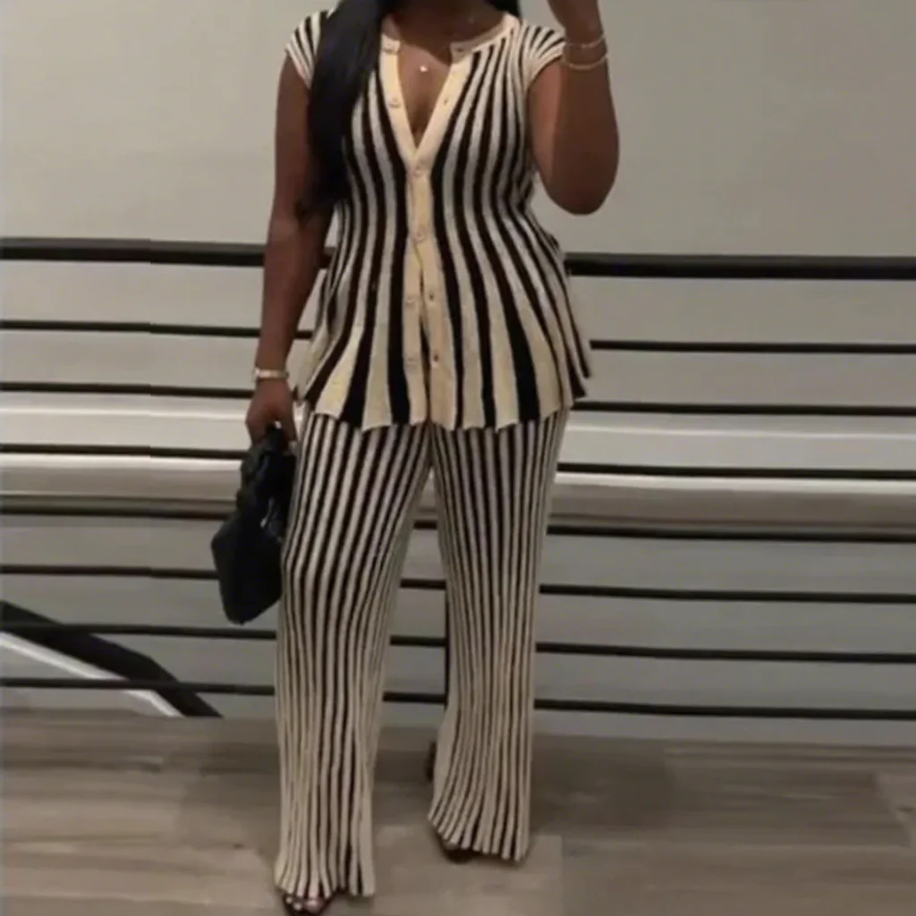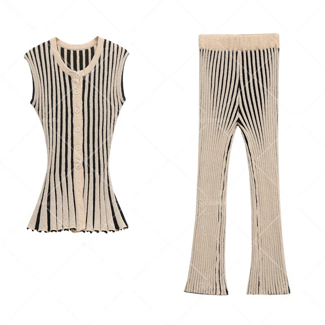 GX8779 Fashion 2026 Summer Clothing Vendor Sleeveless Unique Stripped Color Patchwork Knitted Blouse Tops and Pant 2 Pieces Sets
