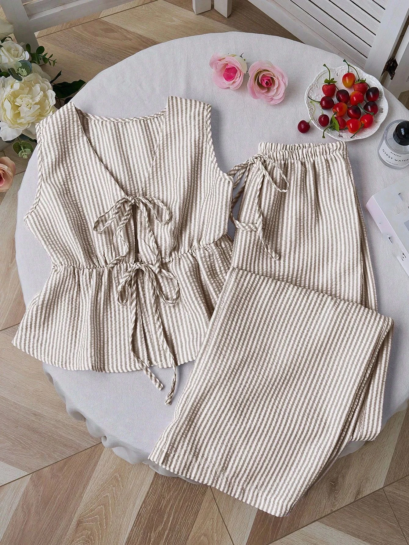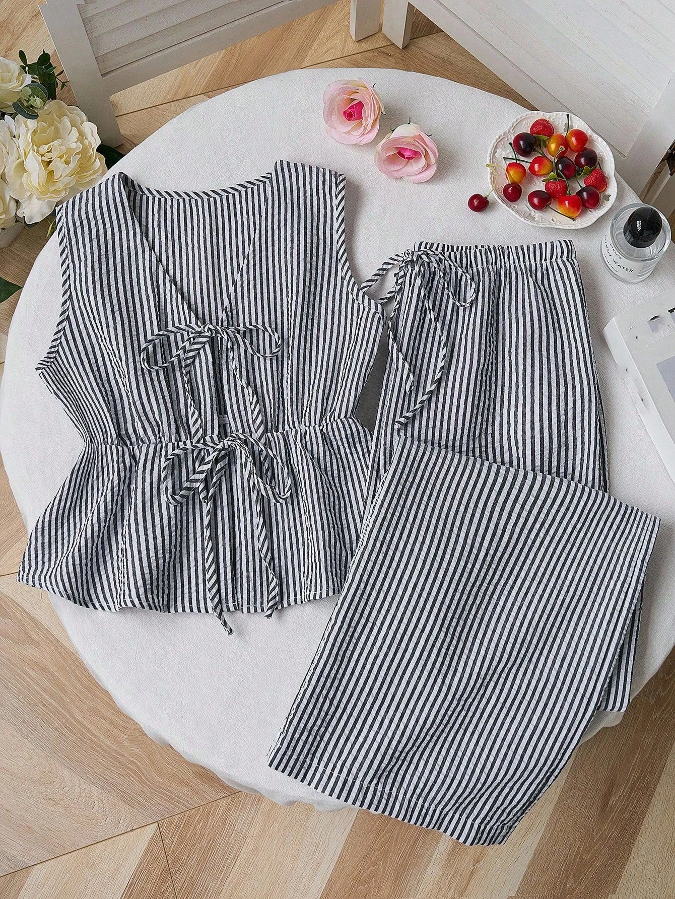 GX25104 Fashion Summer Clothing Boutique Sexy Street Wear Sleeveless Stripped Lace-up Tops and Pant 2 Piece Set