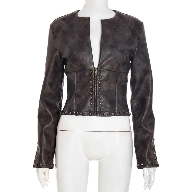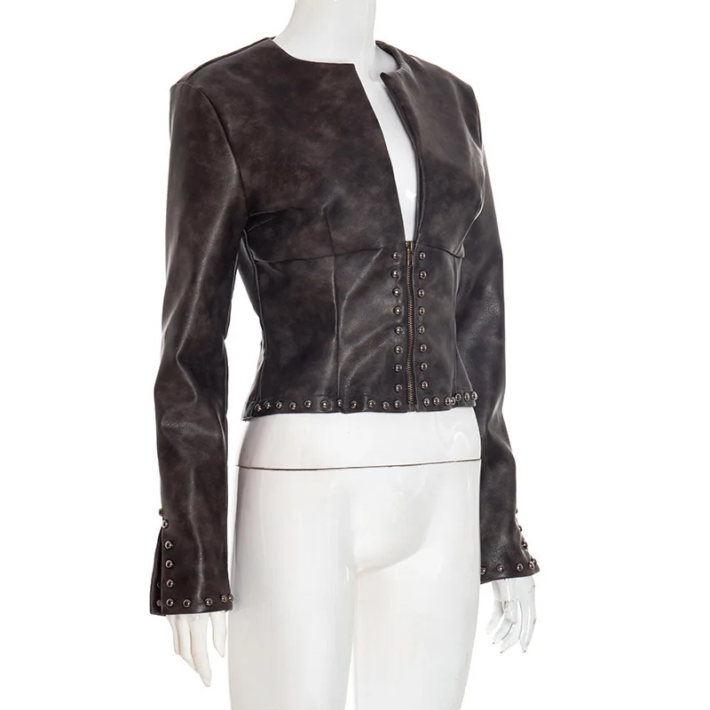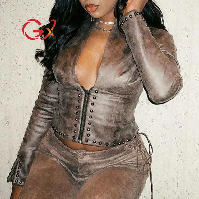 GX25281 Fashion Autumn 2026 Clothing Boutique Ladies Street Wear V-neck Unique Top PU Leather Long Sleeve Zipper Jacket Women