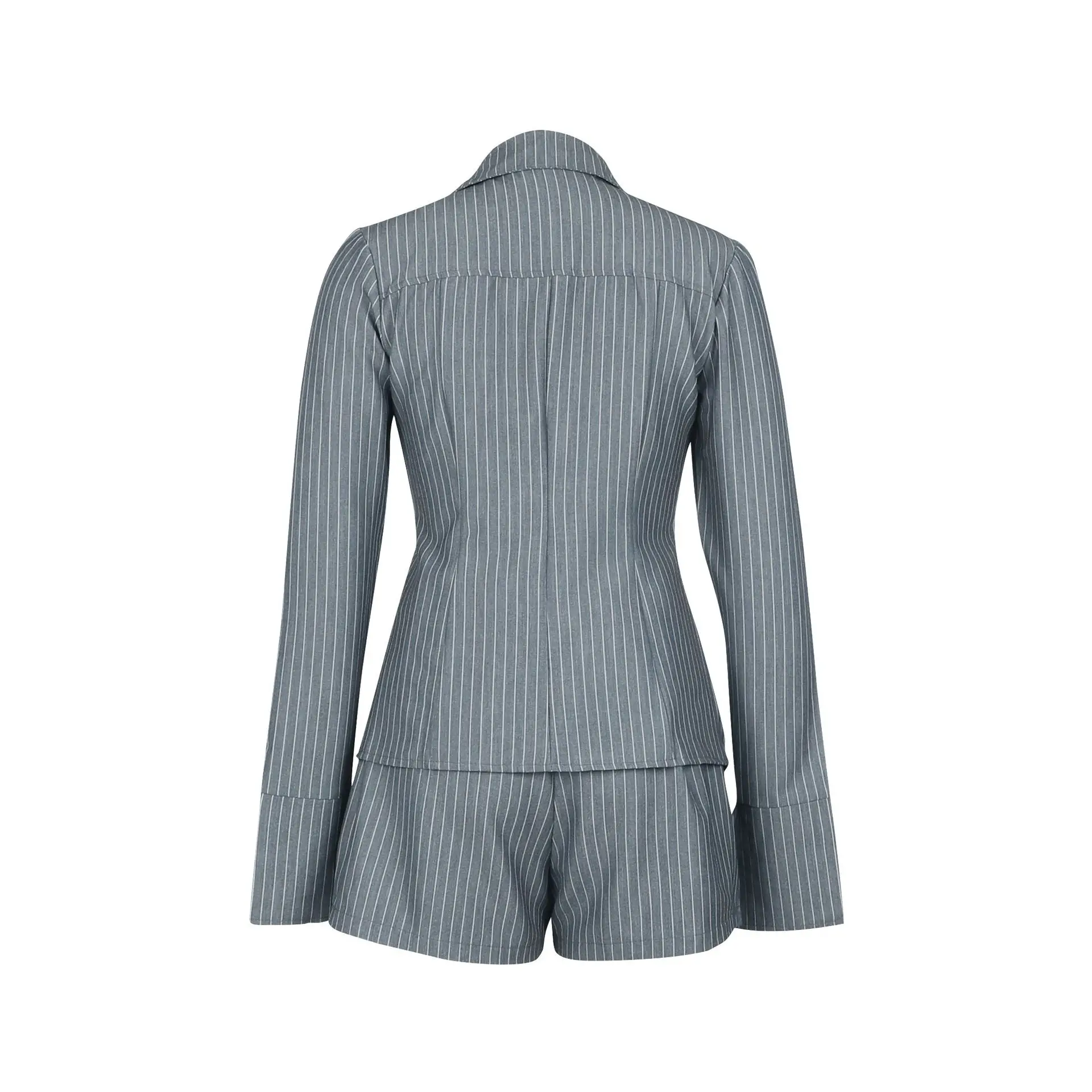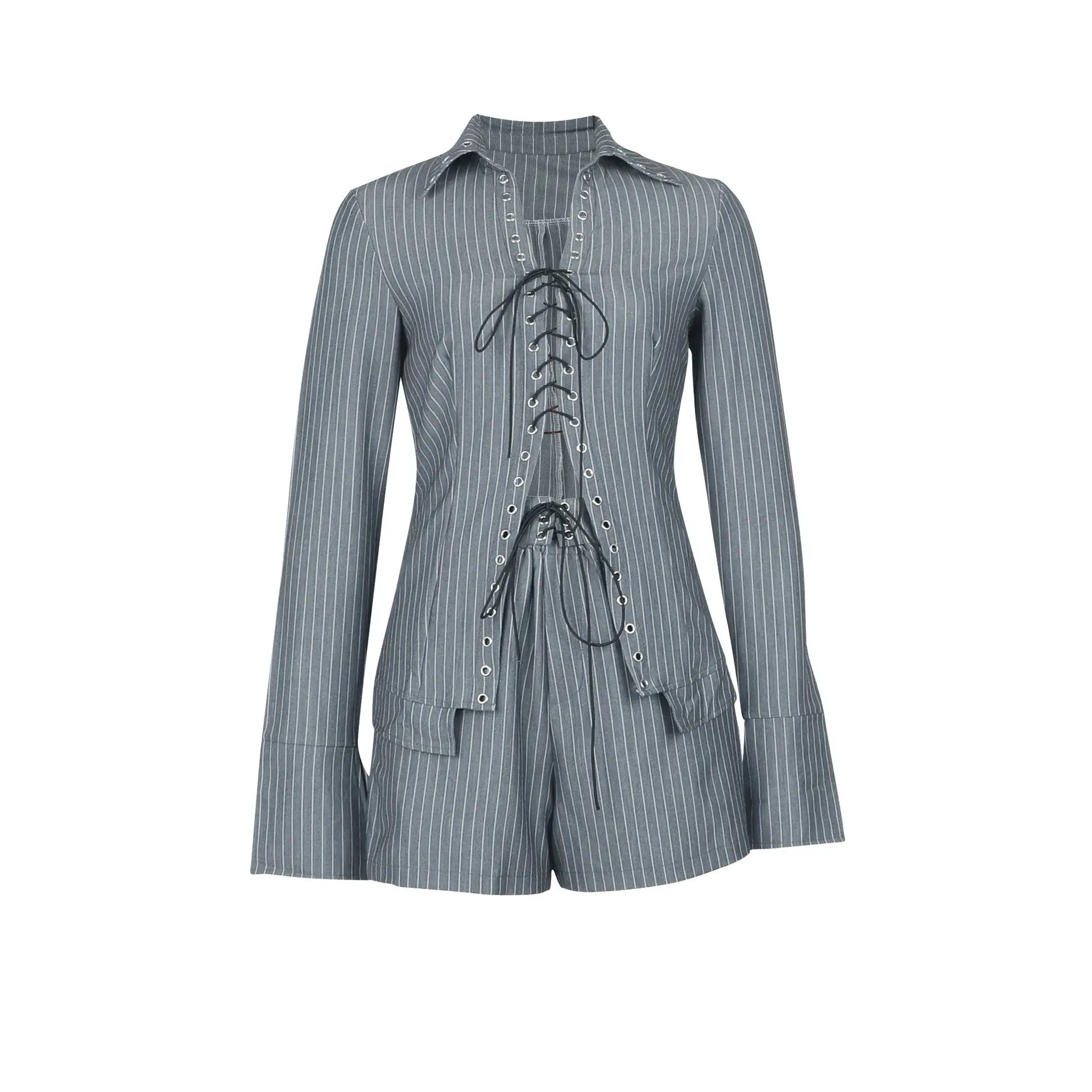 GX324 Fashion 2026 Autumn Clothing Vendor Sexy Street Wear Stripped Long Sleeve Polo Neck Lace-Up Shirt and Shorts 2 Piece Set