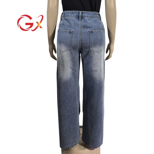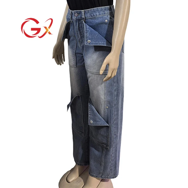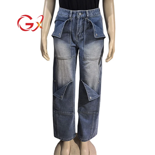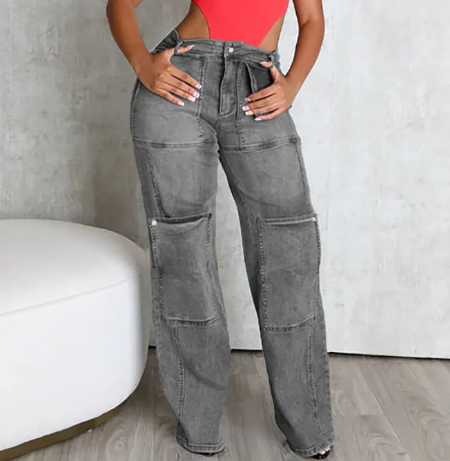 GX0601A Women's Fashion Street Wear Pocket Start Design Straight Washable Jeans Retro Casual Cargo Denim Pant