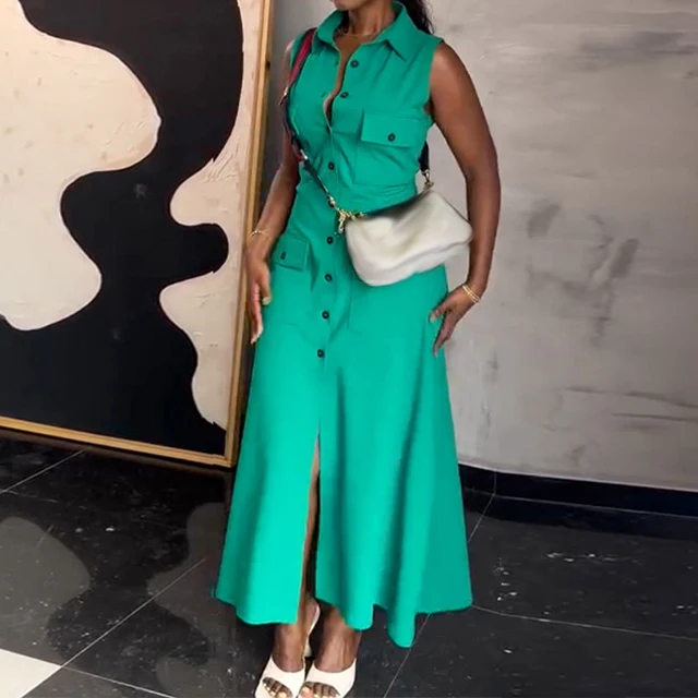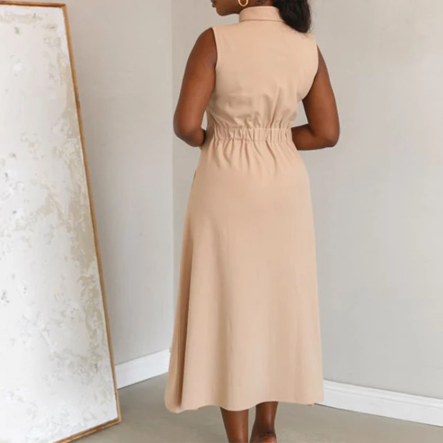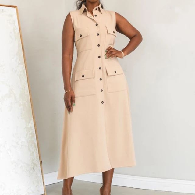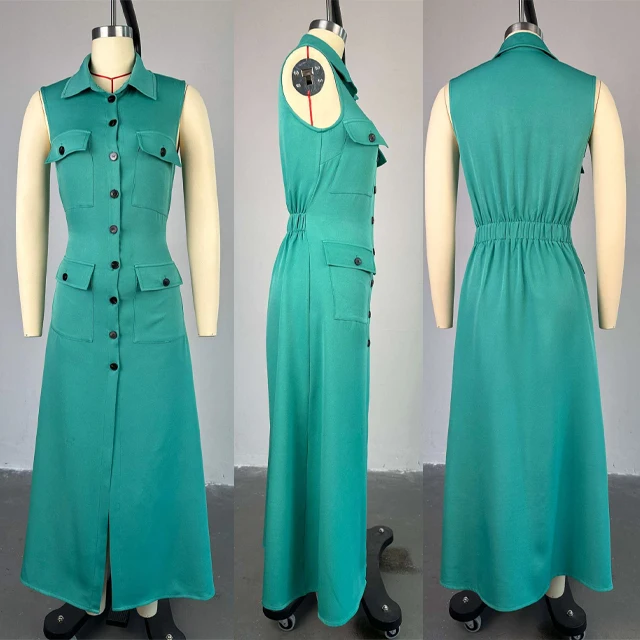 GX7604 Boutique 2026 Sexy Lapel Sleeveless Single Breasted Button Long Dresses Clothing Women Elegant Pocket A-line Maxi Dress