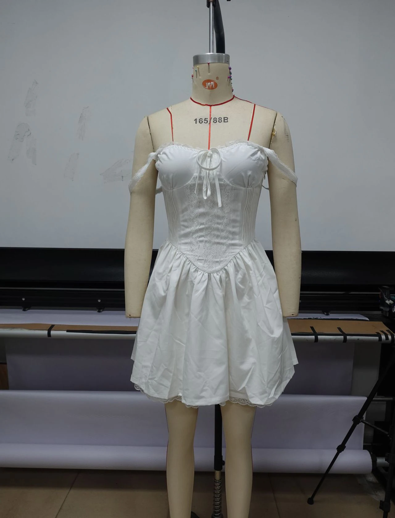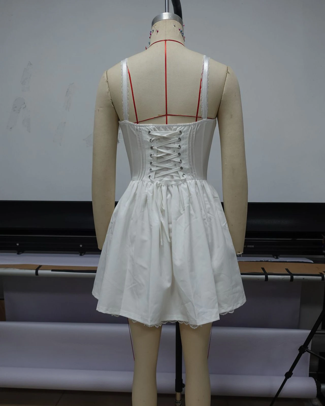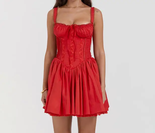 GX2501A Summer 2026 Solid Color New Back Side Lace-up Style Spaghetti Strap Casual Dresses Lace Patchwork A-line Sexy Mini Dress