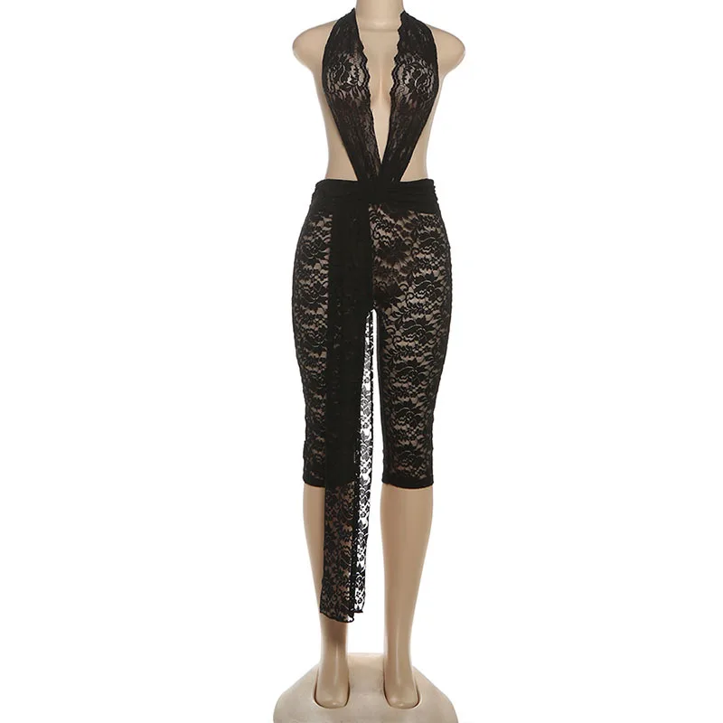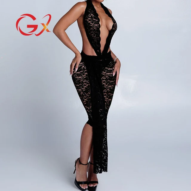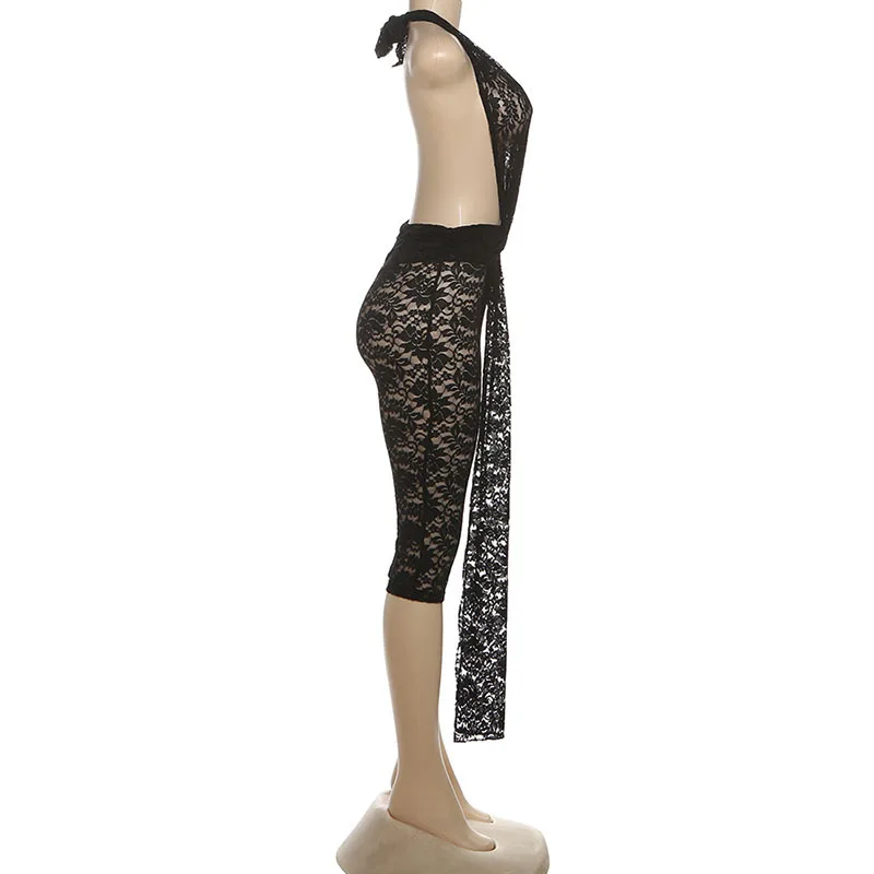 GX2352 Fashion 2026 Women Clothing Boutique Sleeveless Bodycon One Piece Lace Halter See Through Nigh Club Backless Jumpsuit