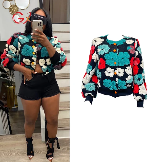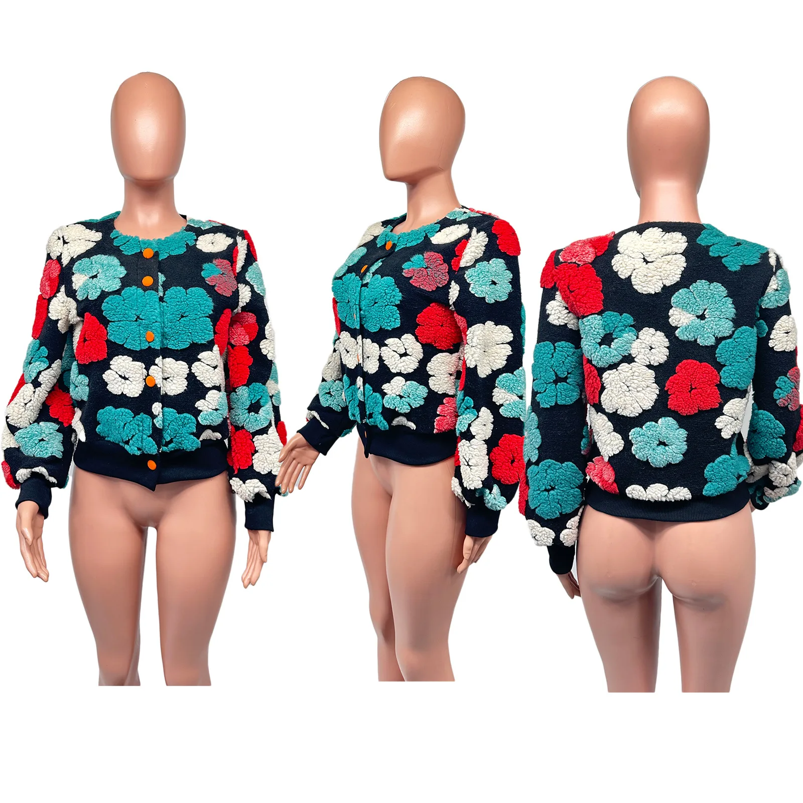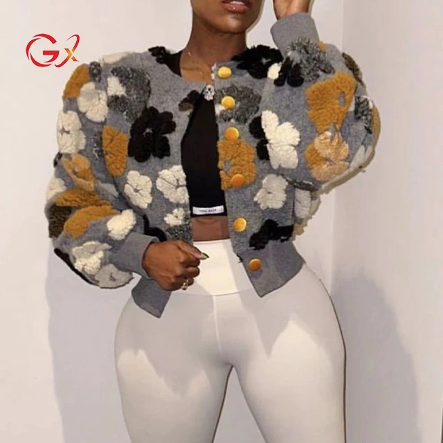 GX6061 Vintage 3D Flower Fuzzy Button Single Breasted Winter Elegant Coat for Women Short Teddy Jackets