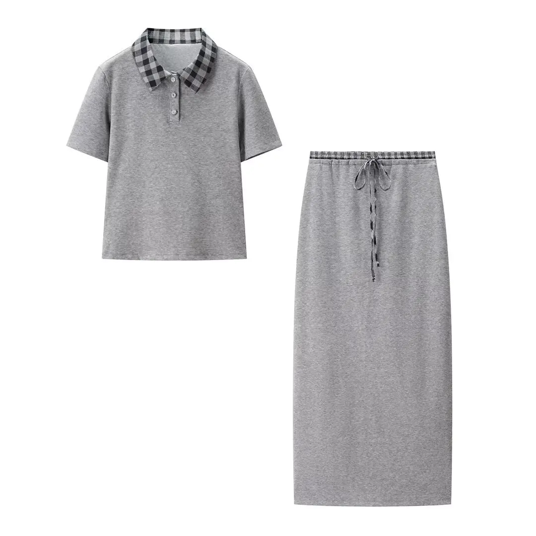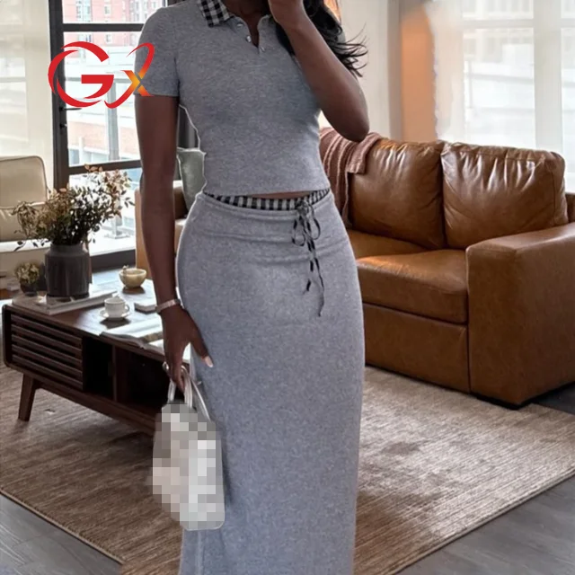 GX0148 Fashion 2026 Summer Women Clothing Boutique Street Wear Short Sleeve Polo Neck T-shirt and Long Split Skirt 2 Piece Sets