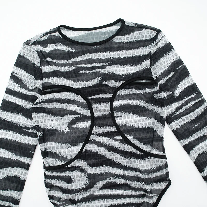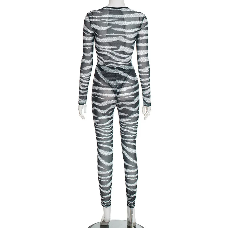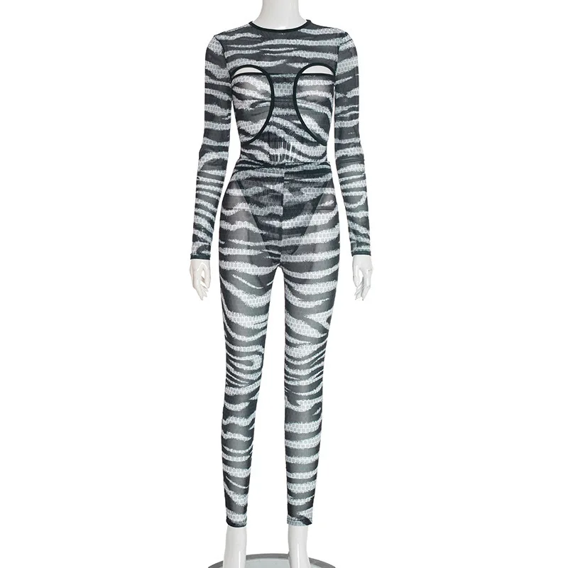 GX25306 Fashion Women Clothing Vendor Sexy See Through Nigh Club Wear Long Sleeve Printed Bodysuit and Jogger Pant 2 Piece Set