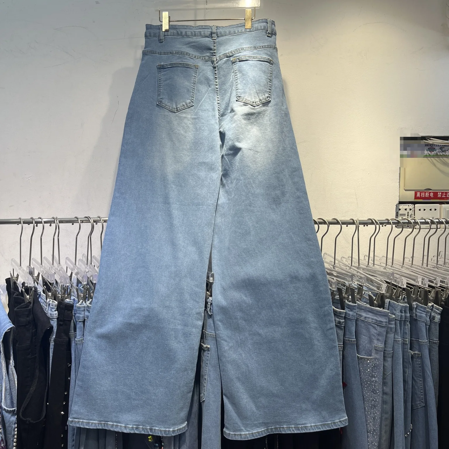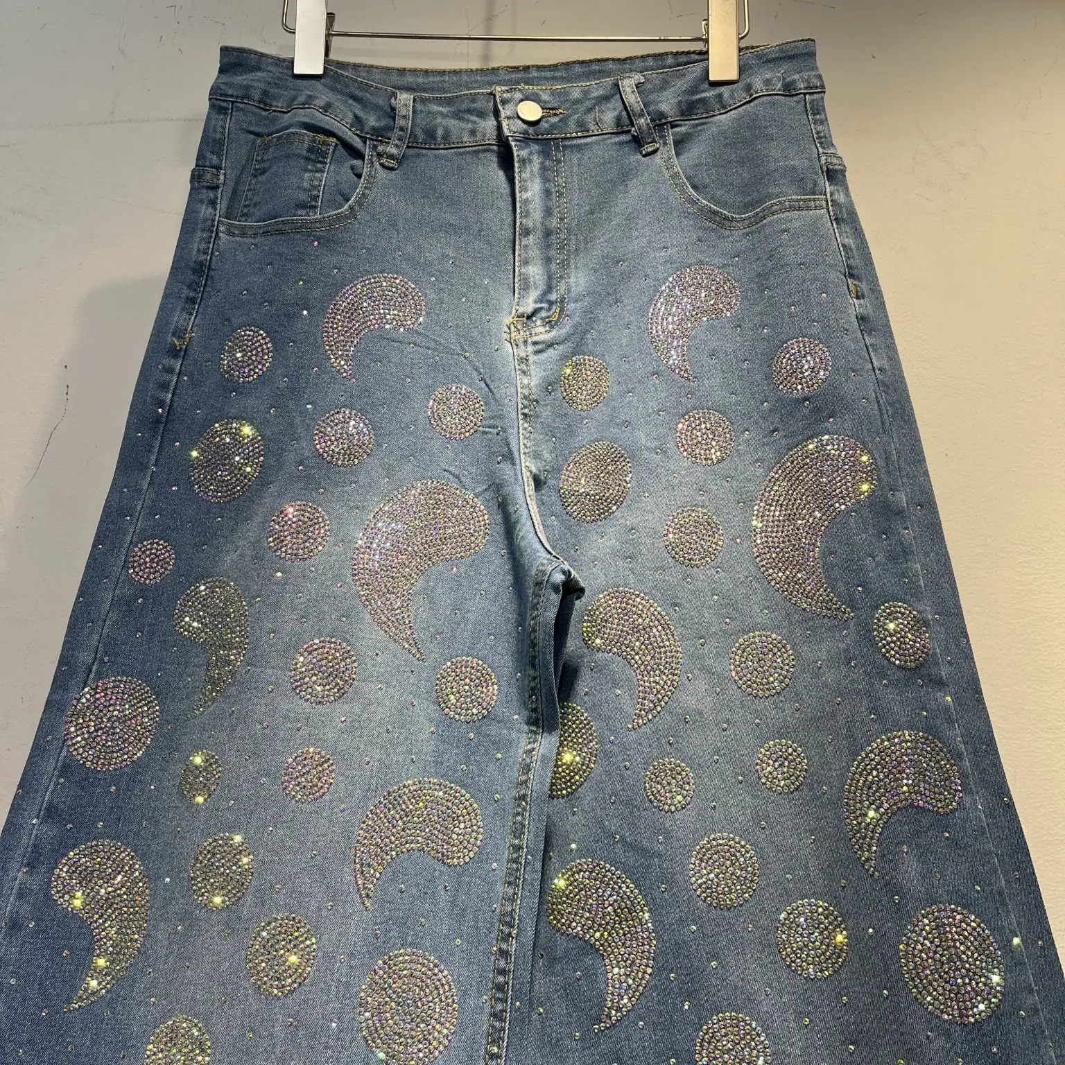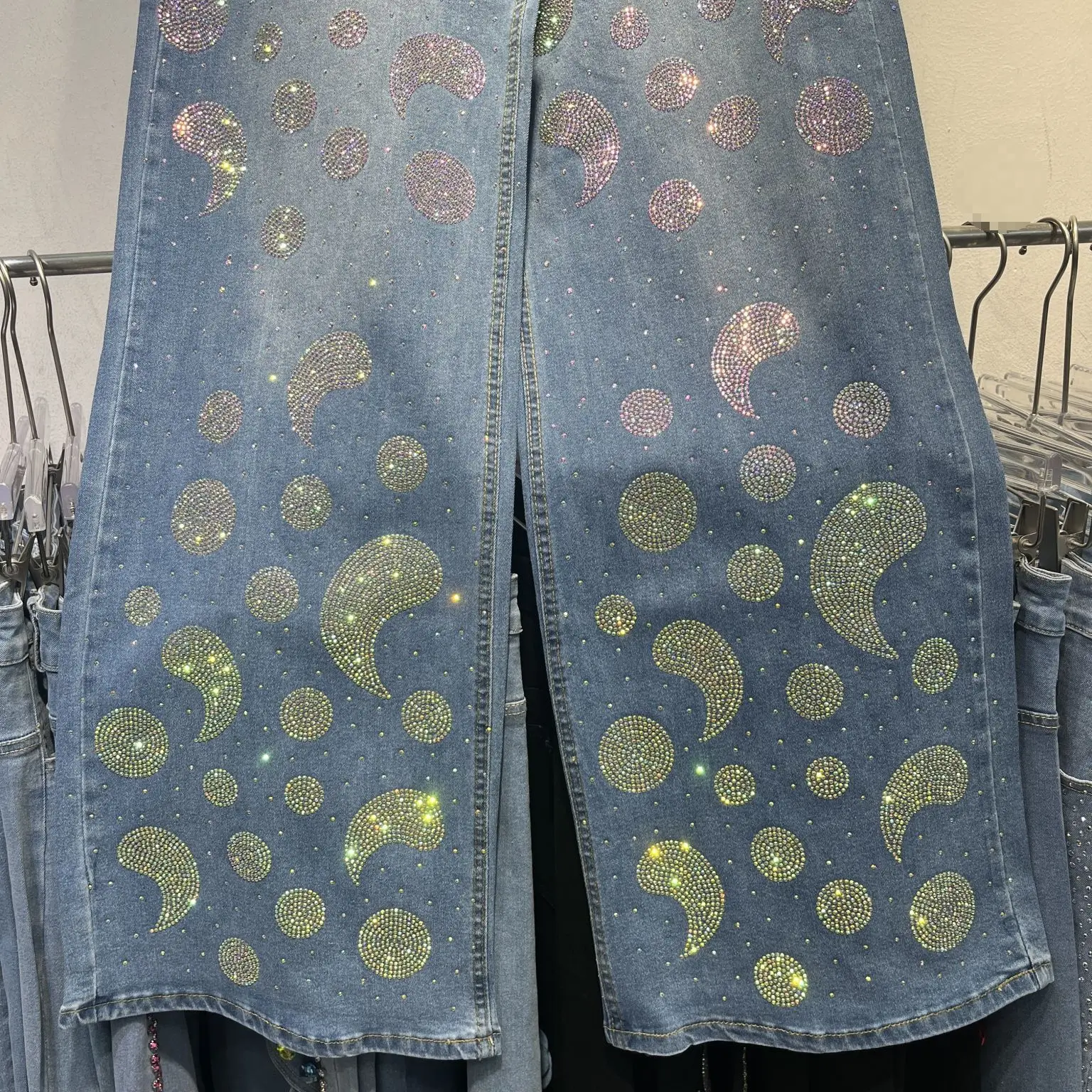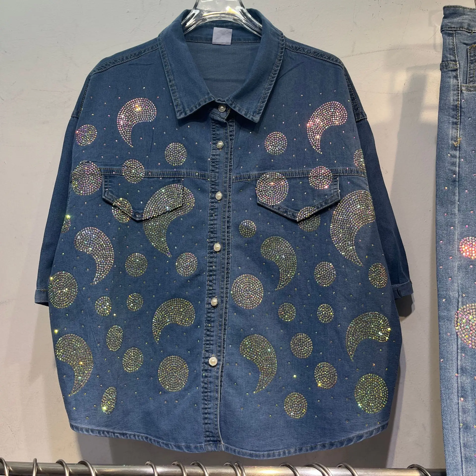 GX61789 Luxury Quality Women Clothing Boutique Street Wear Long Sleeve Denim Sequin Print Jacket and Wide Leg Pant 2 Piece Set