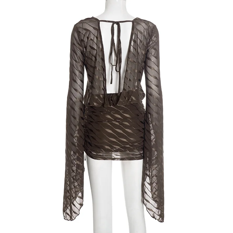 GX25418 Fashion 2026 Fall Women Clothing Boutique Long Flare Sleeve Deep V-neck Mini Dress Sexy See Through Backless Dresses