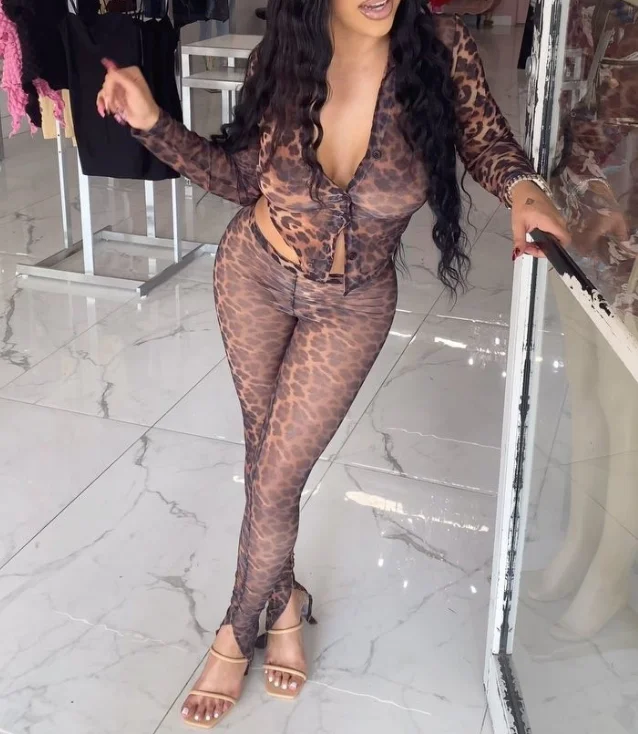 GX8667 Fashion Spring Fall Women Clothing Boutique Street Wear Long Sleeve Mesh See Through Leopard Tops and Pant 2 Piece Set