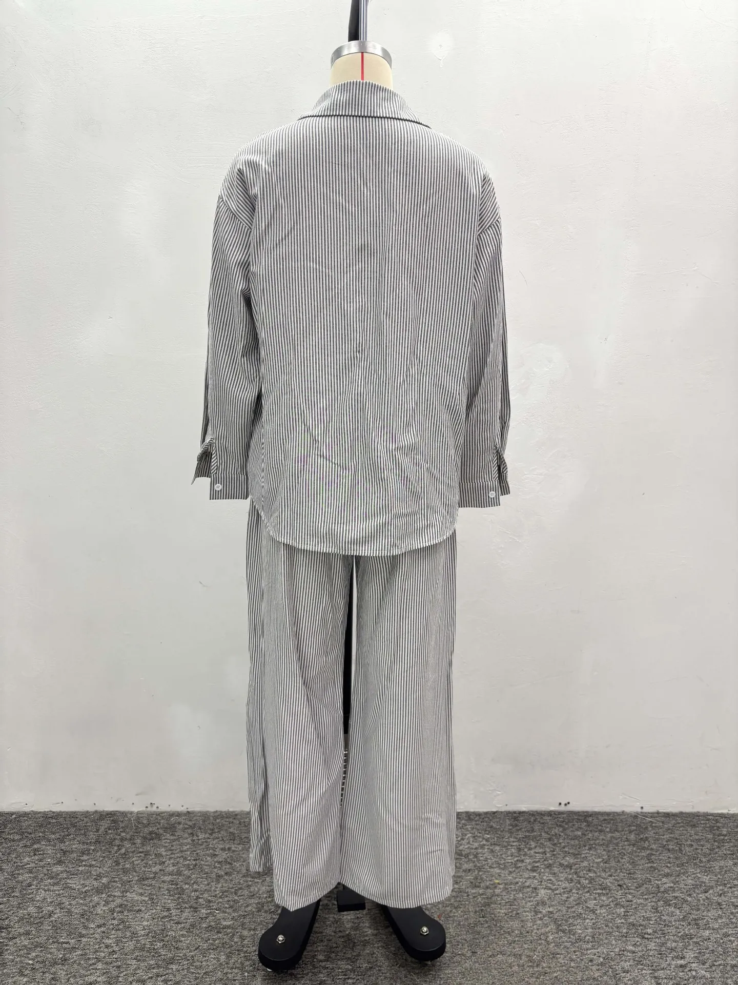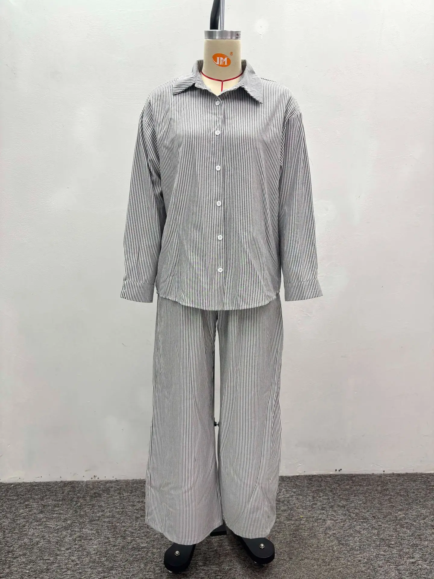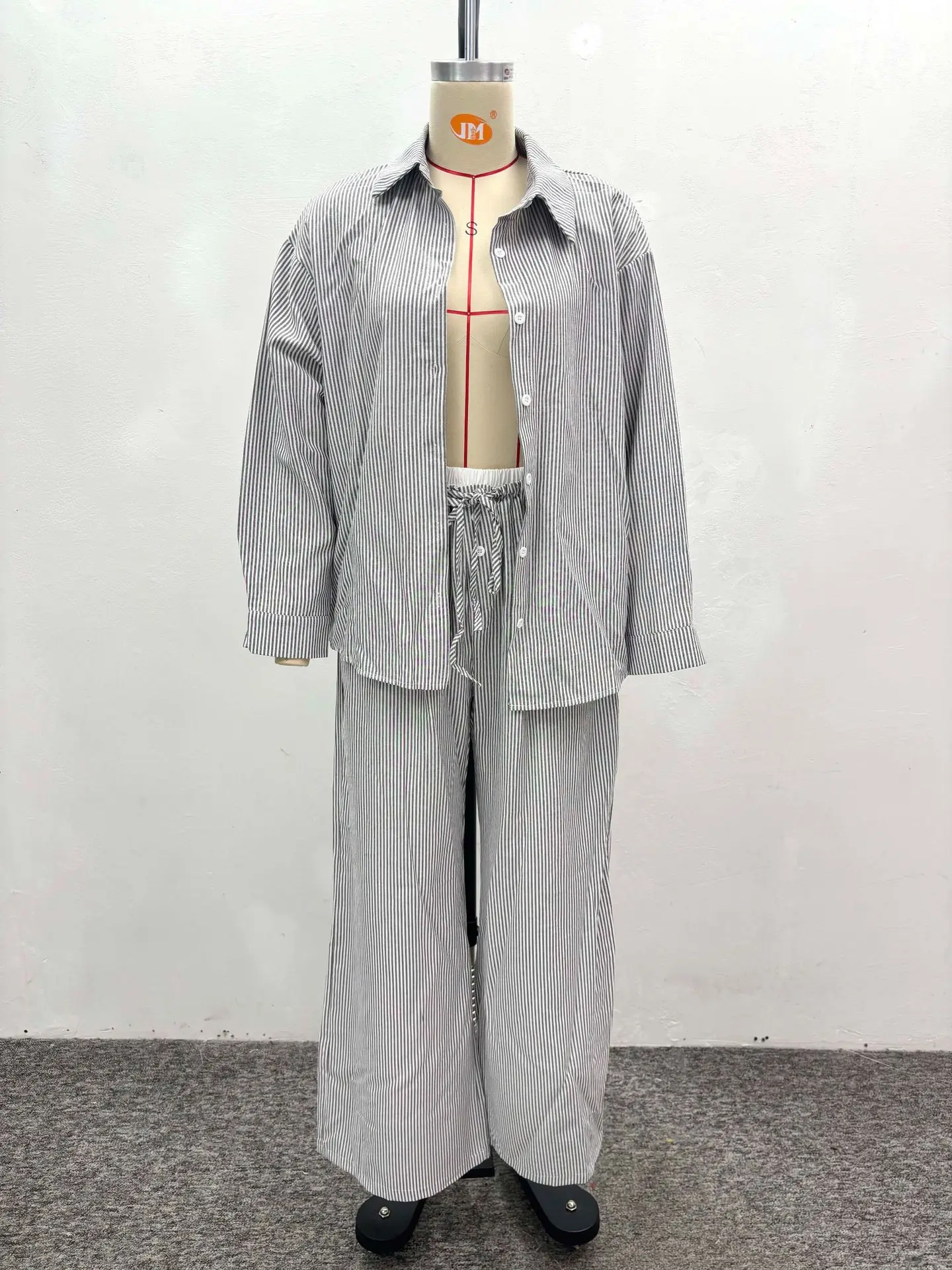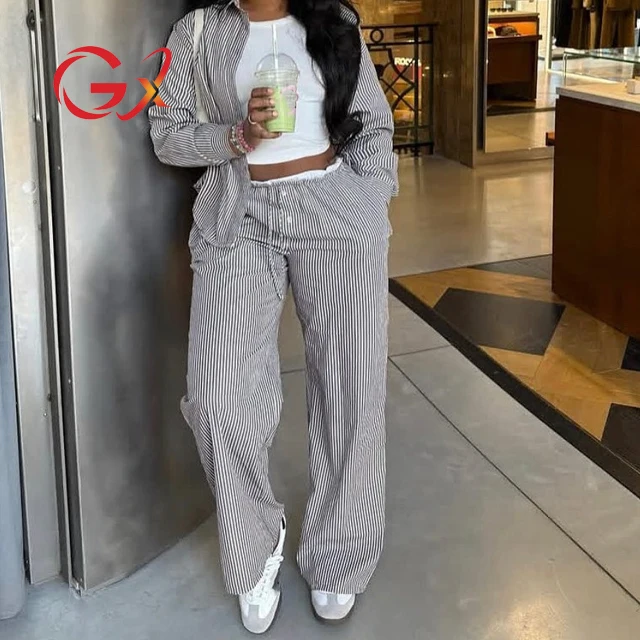 GX6455 Fashion 2026 Fall Women Clothing Boutique Street Wear Long Sleeve Stripped Shirt and Wide Leg Pant 2 Piece Set