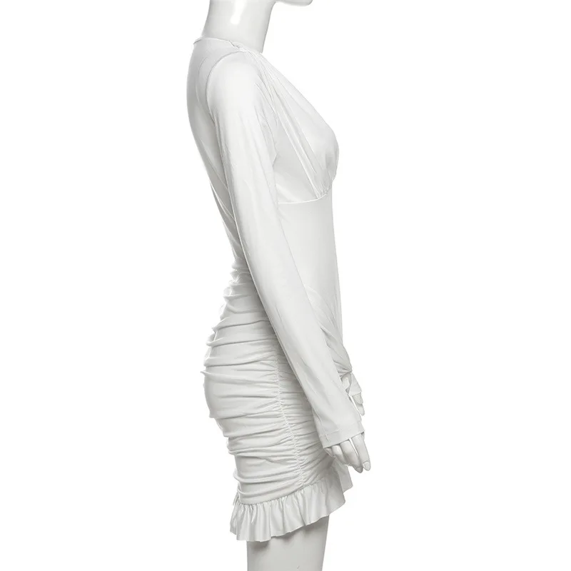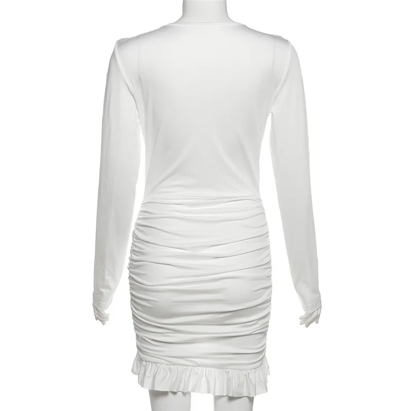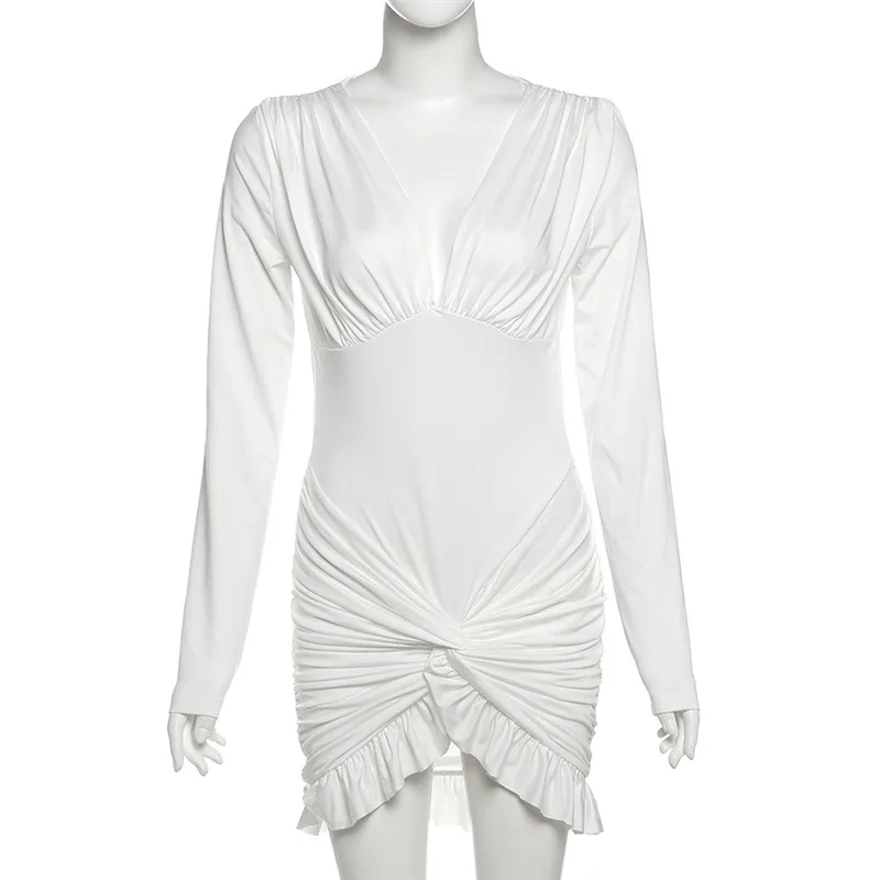 GX25748 Fashion Autumn Clothing Vendor Women Street Wear Long Sleeve Sexy Ruffled Pleated Dresses Deep V-Neck Elegant Mini Dress