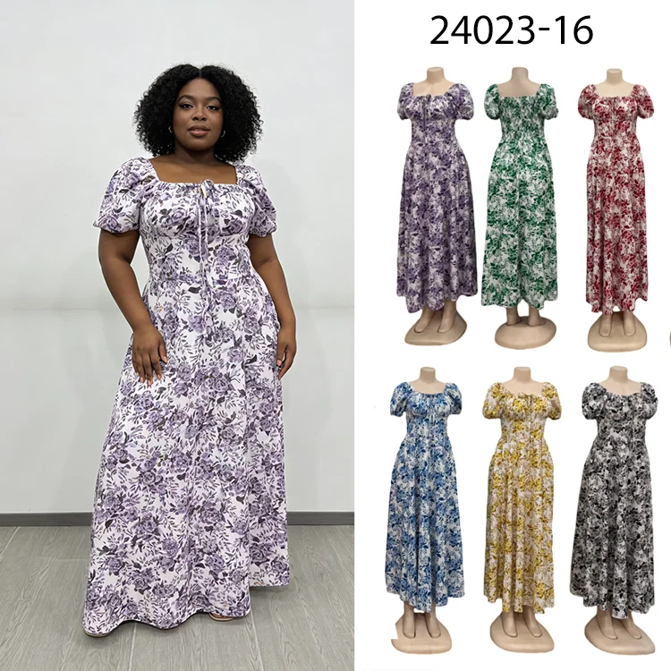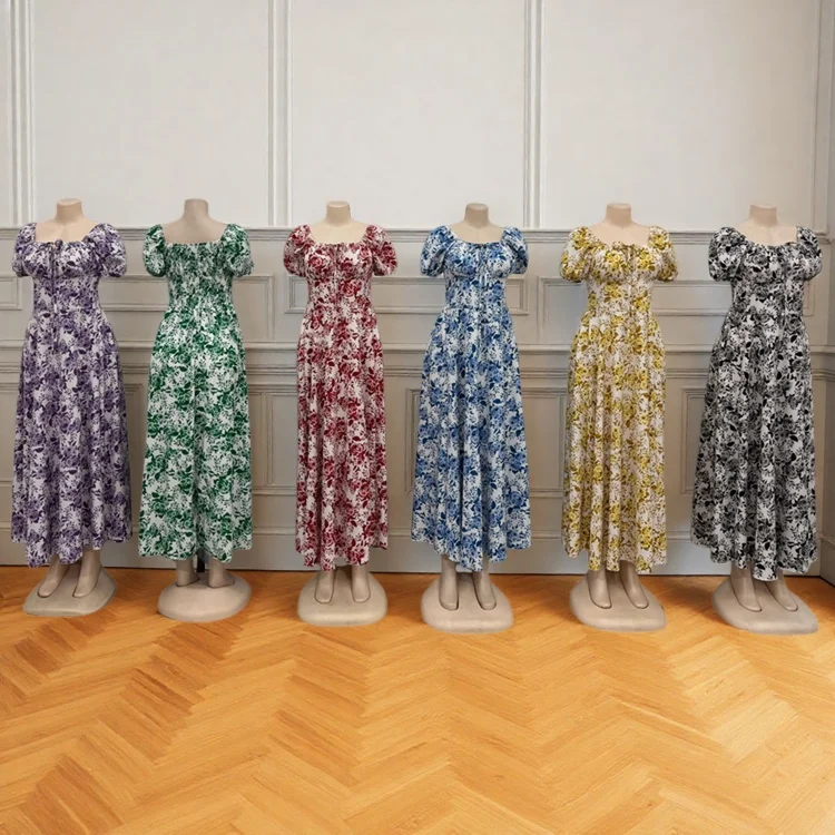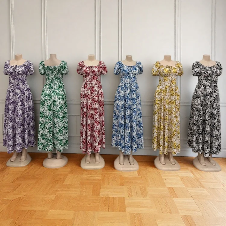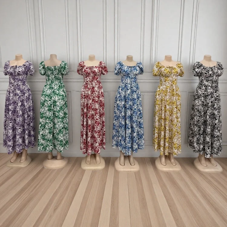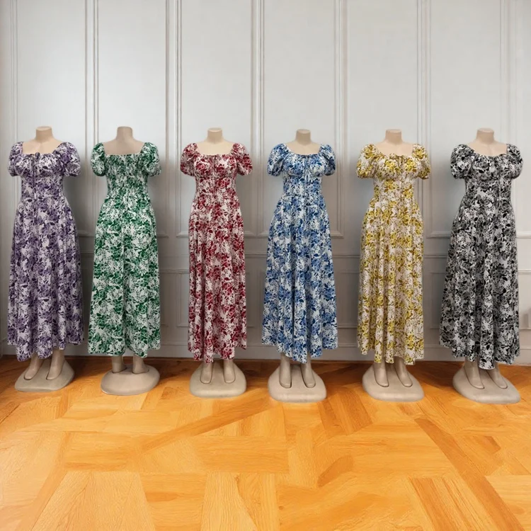 New Wholesale Spring Casual High Waist Printed Short Sleeve square Collar Fashion Dress