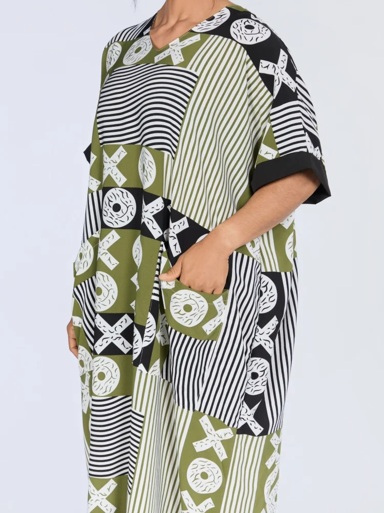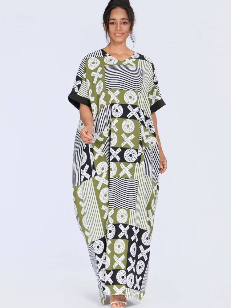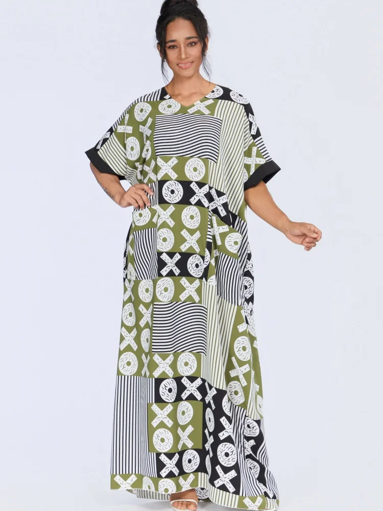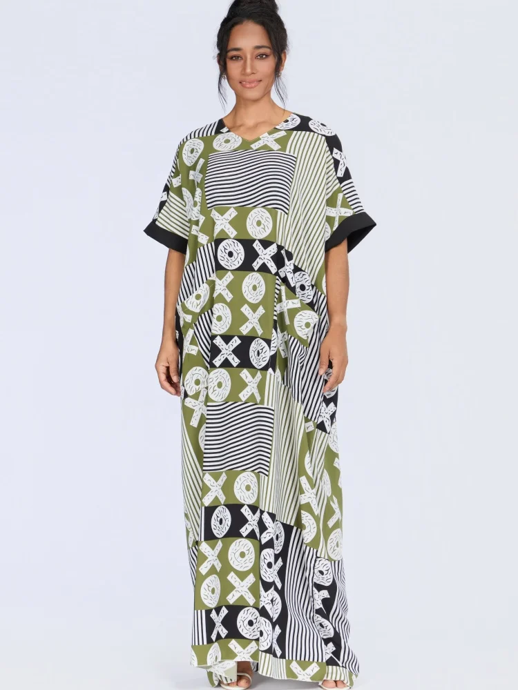 New Wholesale Summer Fashion Women Middle East Muslim Loose Robe Short Sleeve V-Neck Printed Dress
