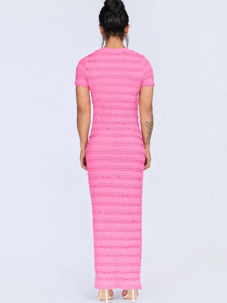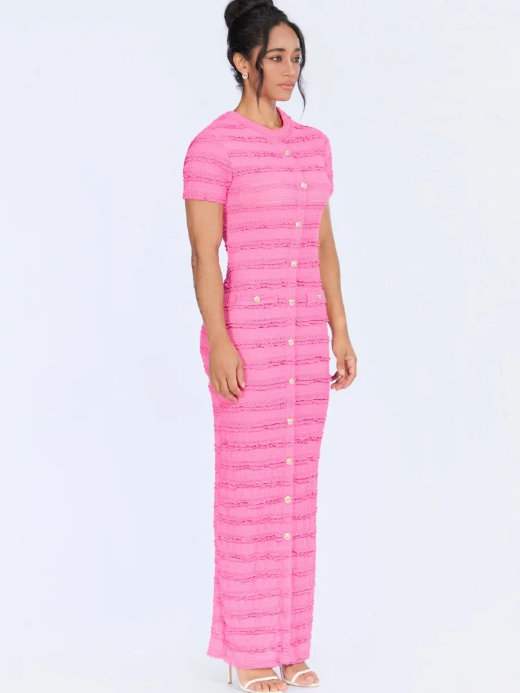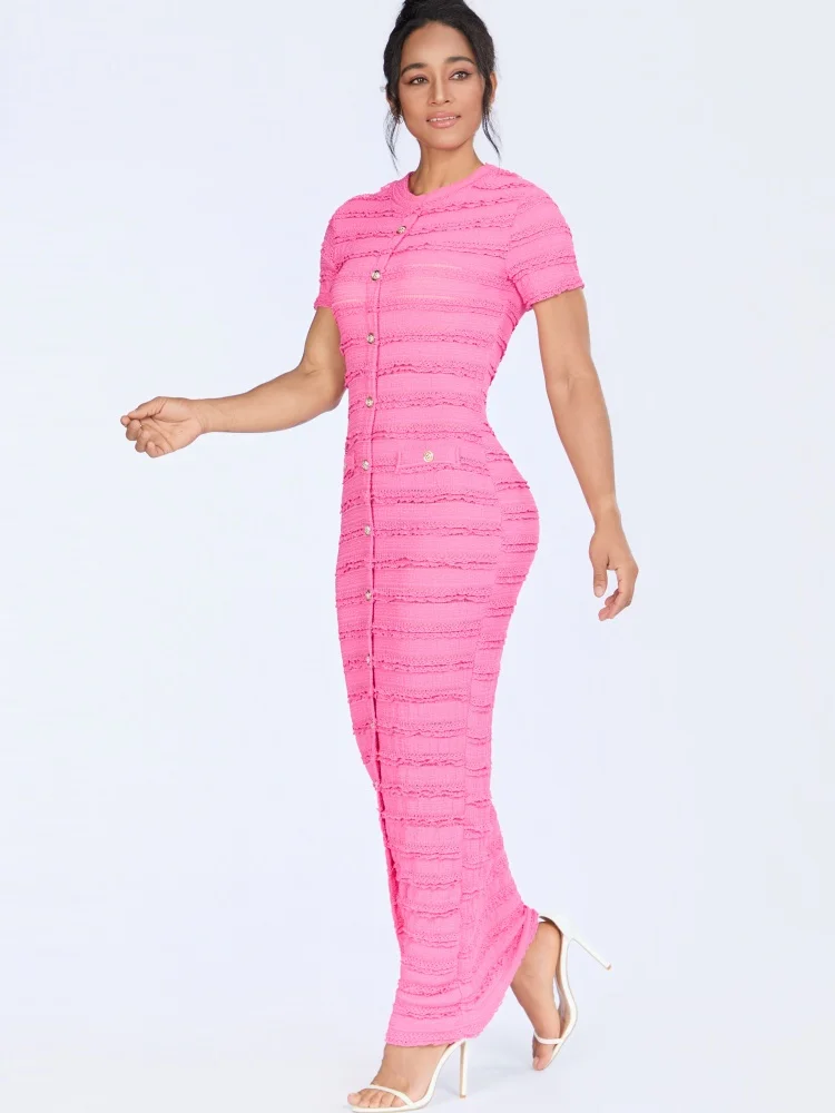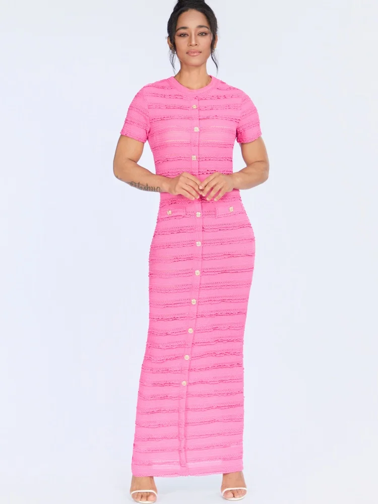 New Style Wholesale Summer French Button Short Sleeve O Neck Single-breasted Knitted A- Line Fashion Women's Dress