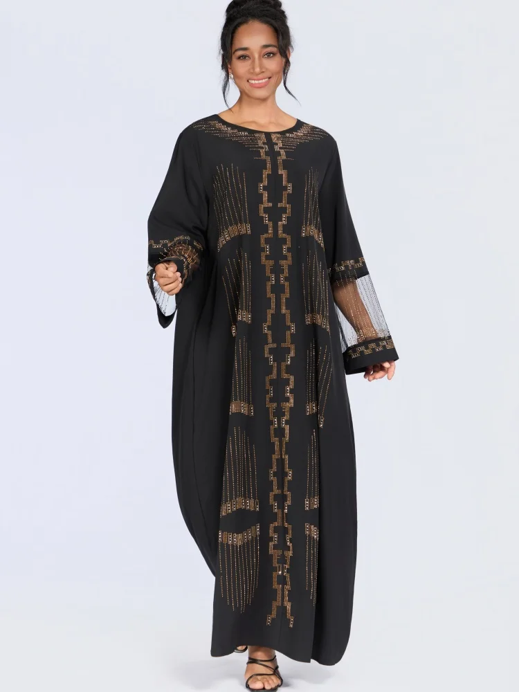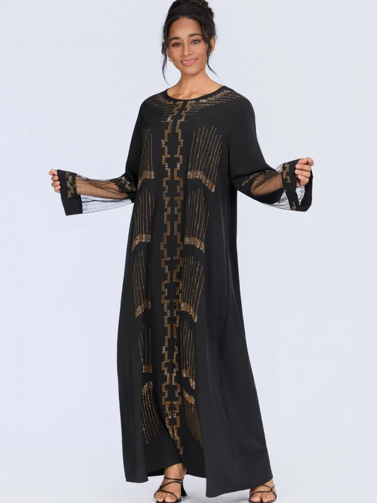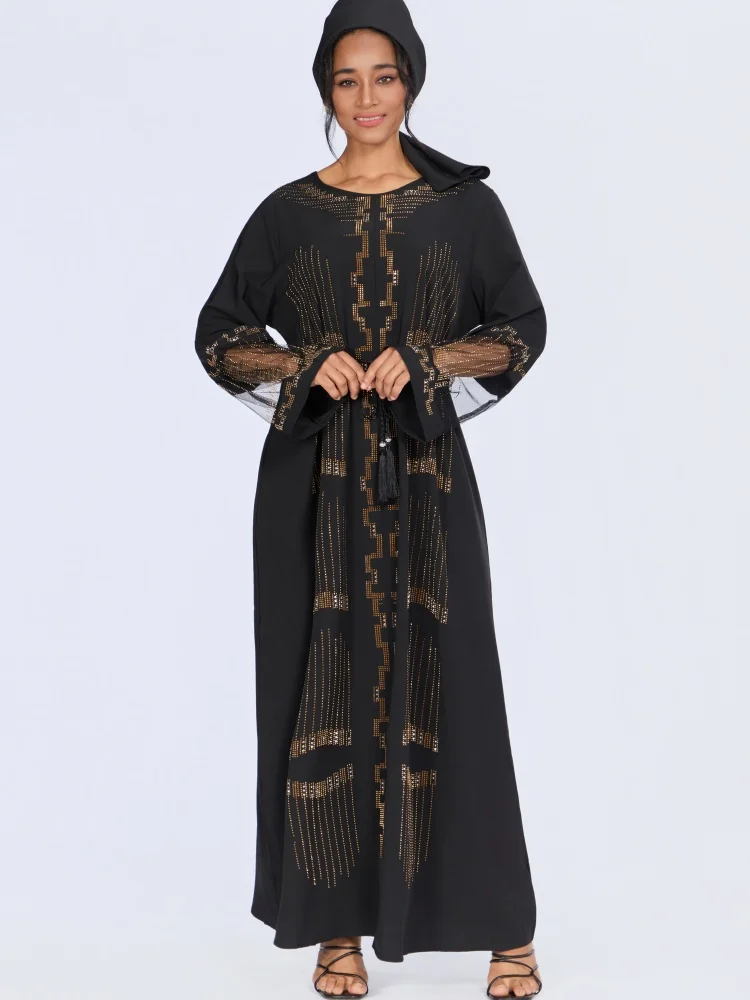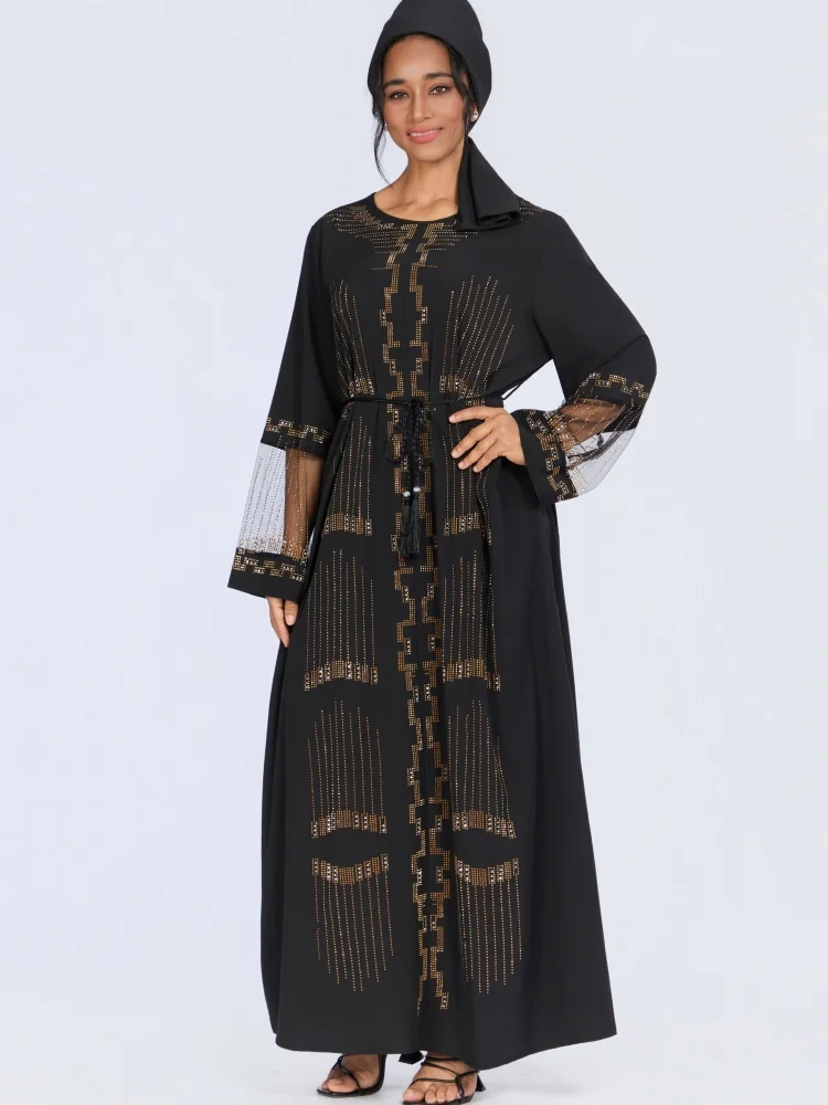 New Wholesale Middle East Muslim Robe Bright Diamond Long Sleeve Through Yarn O-neck Dress