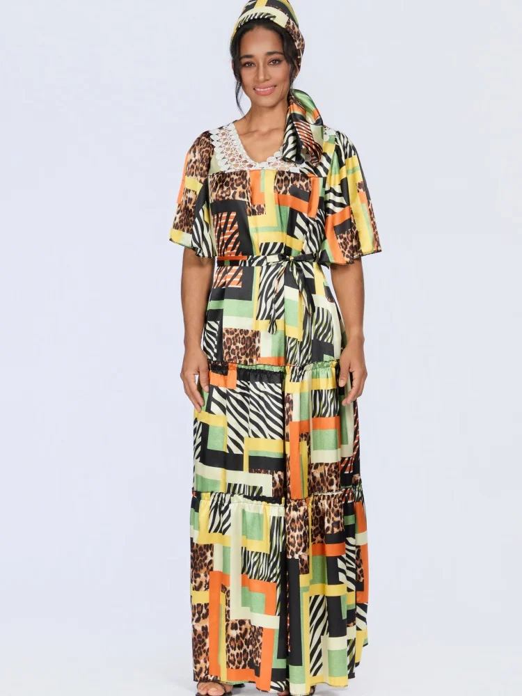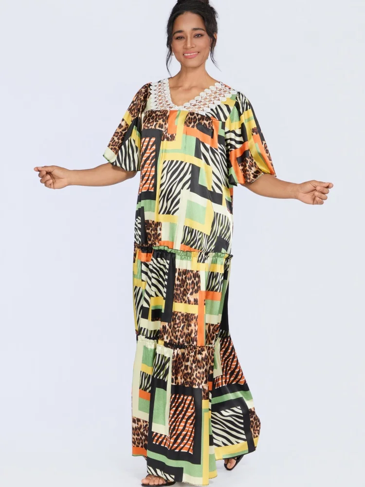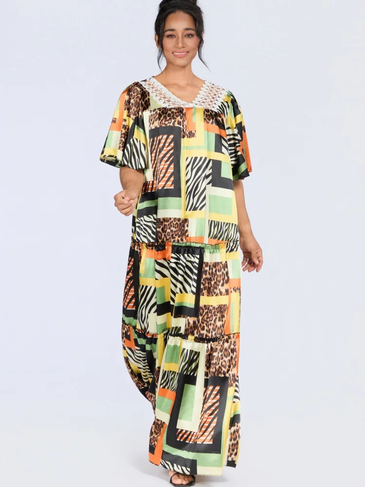 New Wholesale Summer Fashion Stitching Printing Retro Lace V-neck Short Sleeve Loose Casual Dress