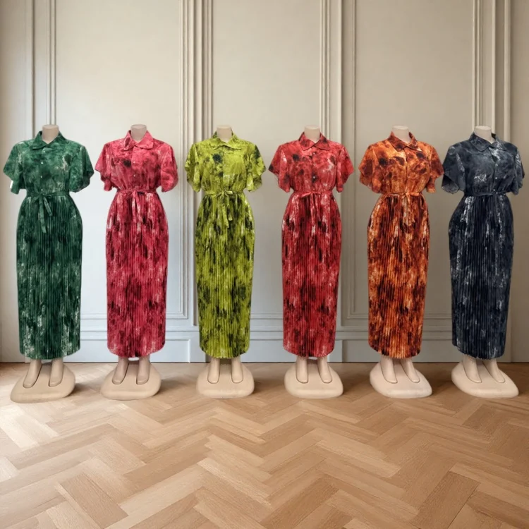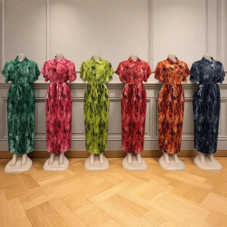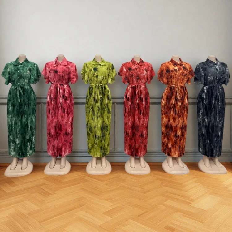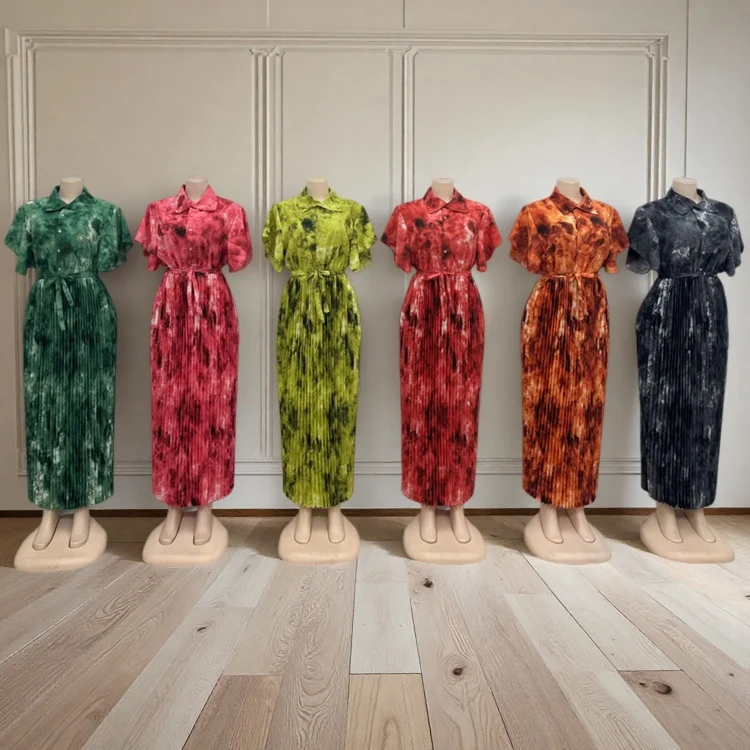 Wholesale New Women's Printed Short Sleeve Elegant Lapel Pleated Vintage A- Line Dress