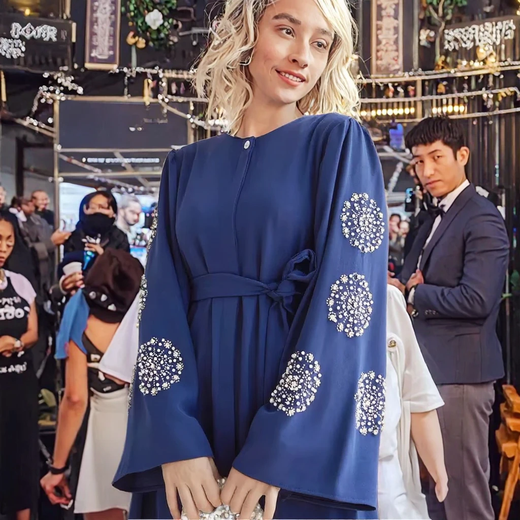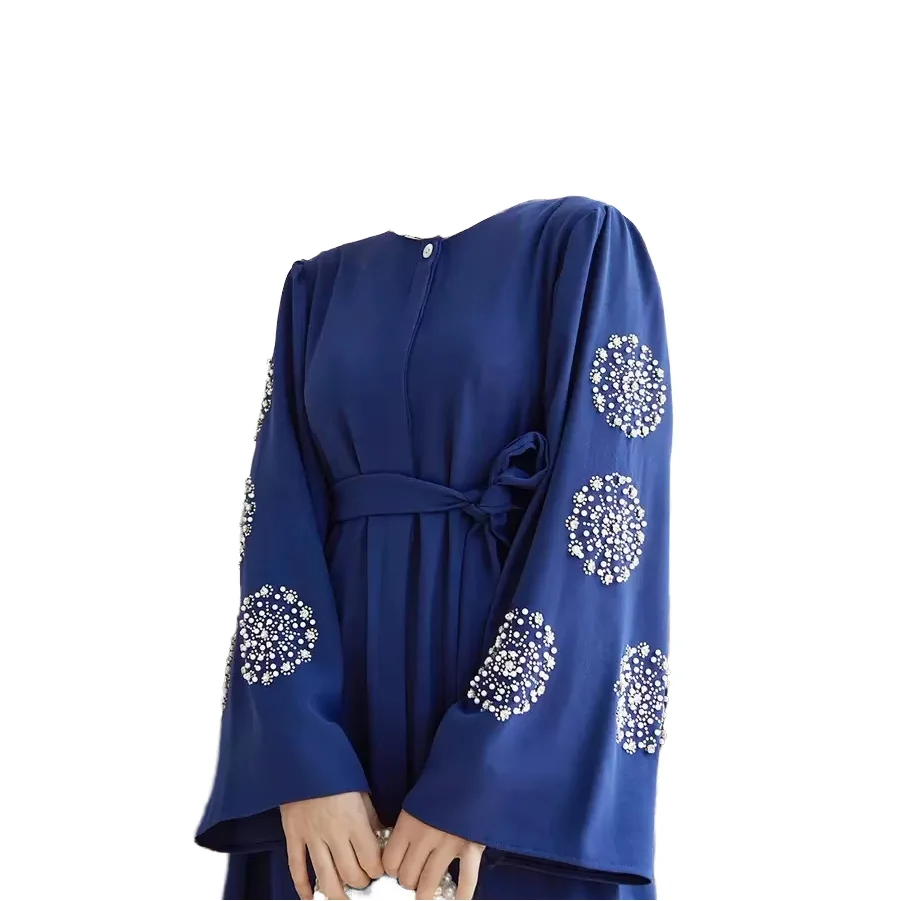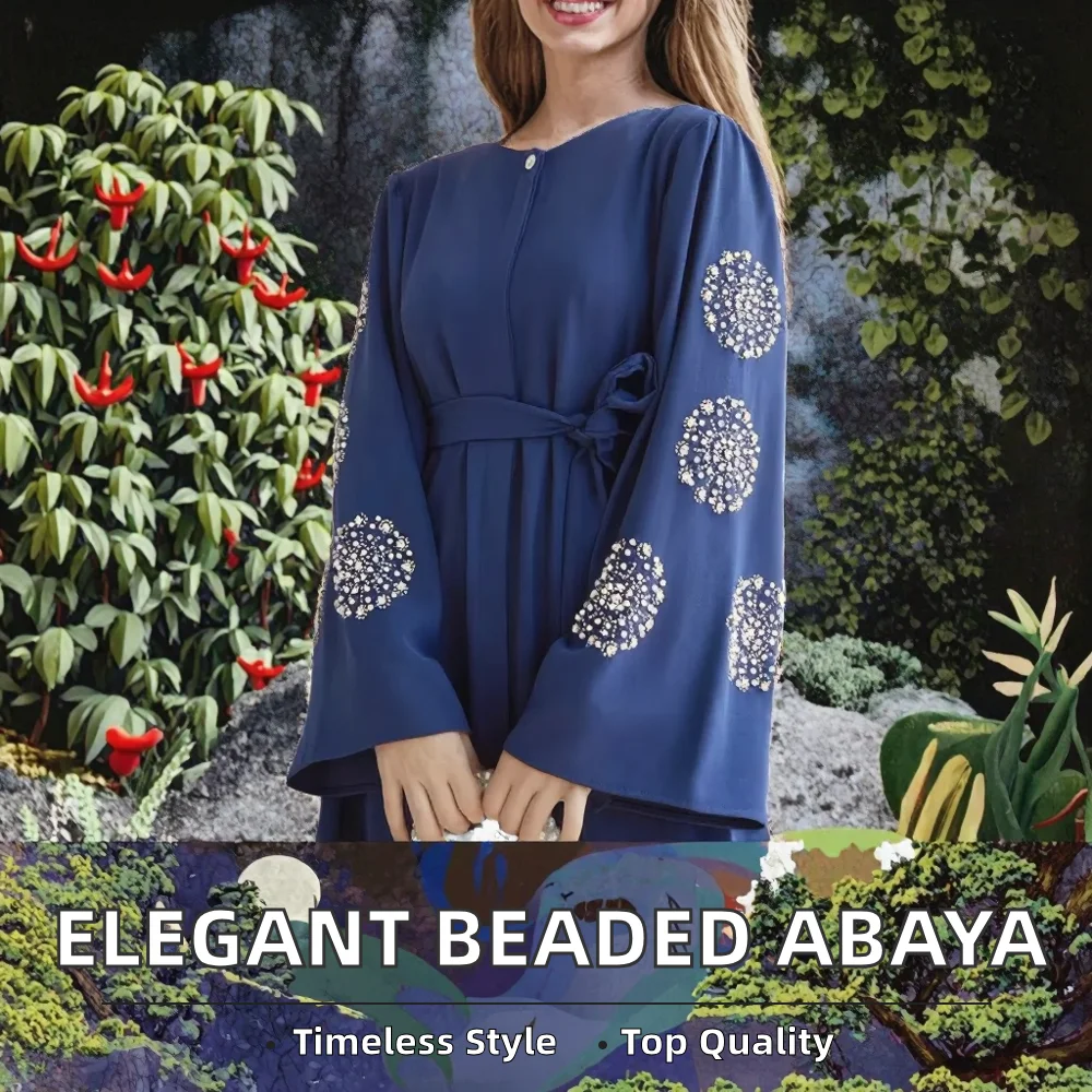 Hot Selling Elegant Modest Spring Summer Abaya Dress Women Anti-static Heavy Beading Rhinestone Long Gown Made Polyester Middle