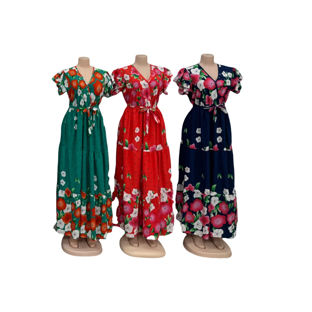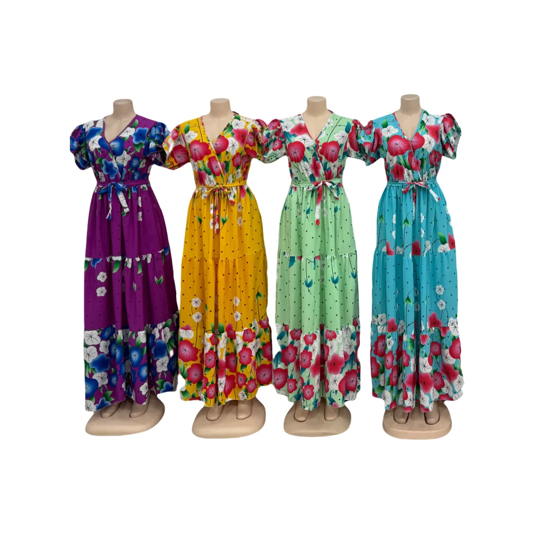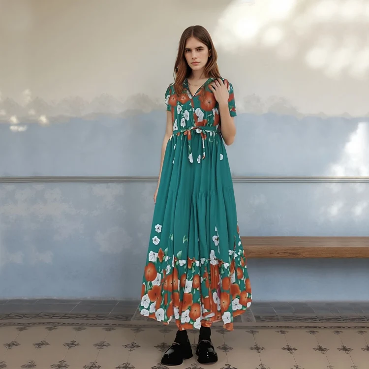 Retro Waist Cinching Slim Fit Casual Mid Length Women's Lantern Sleeve Printed Pleated Dress