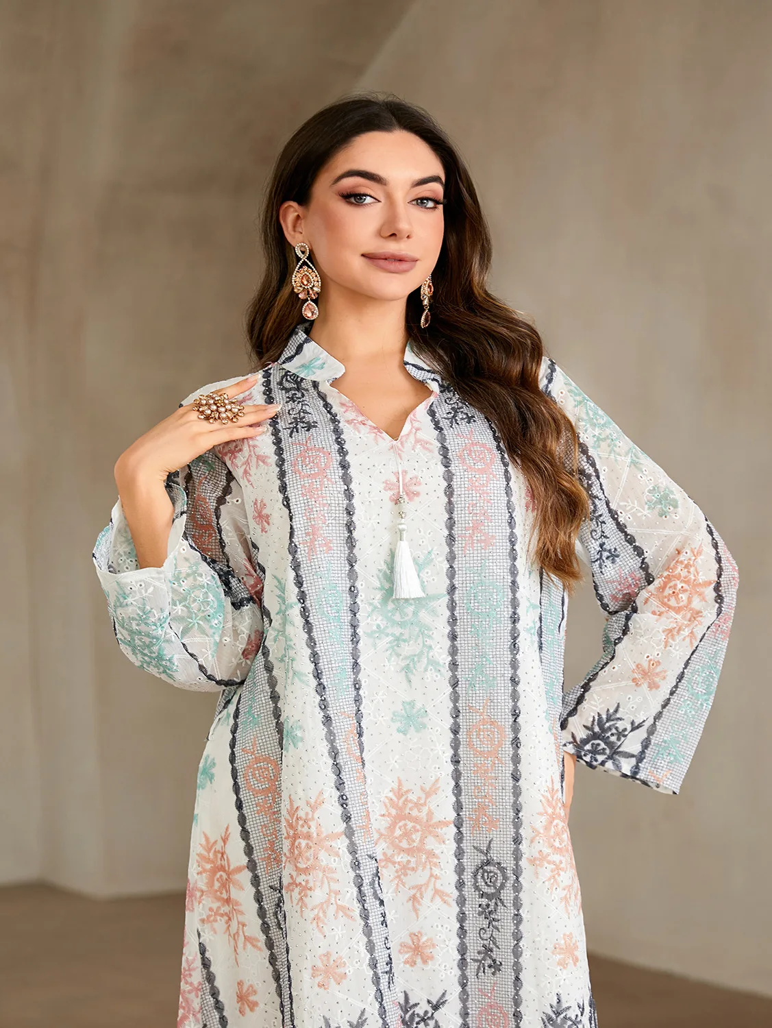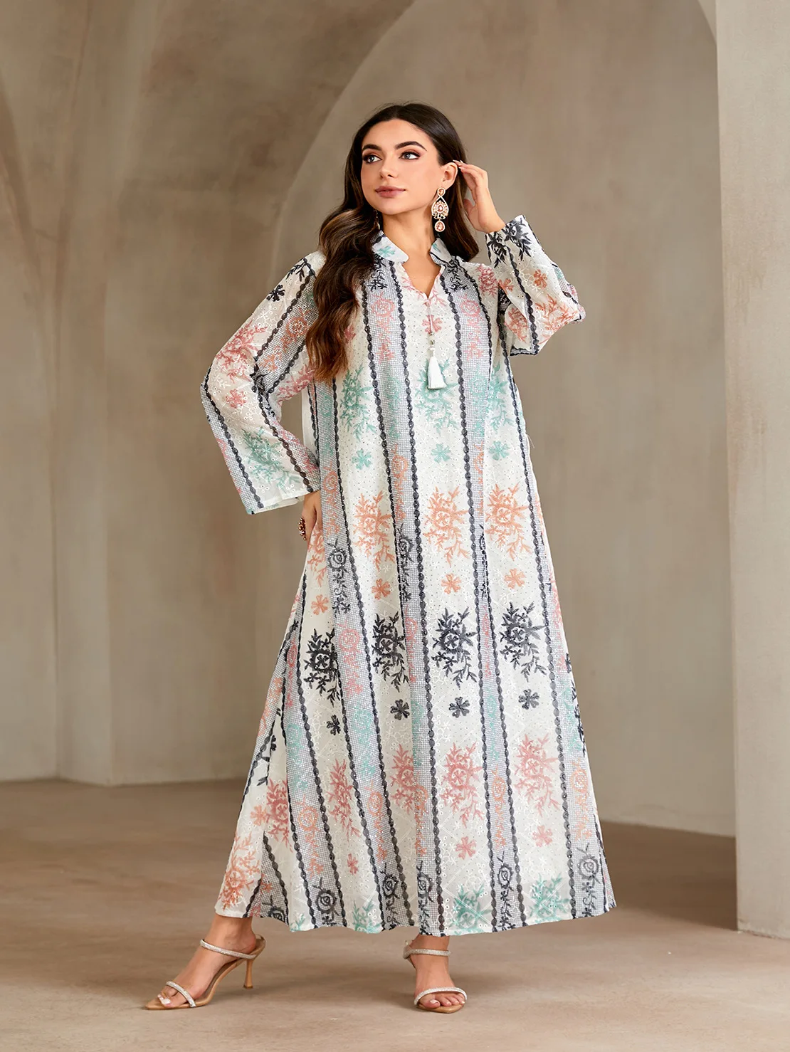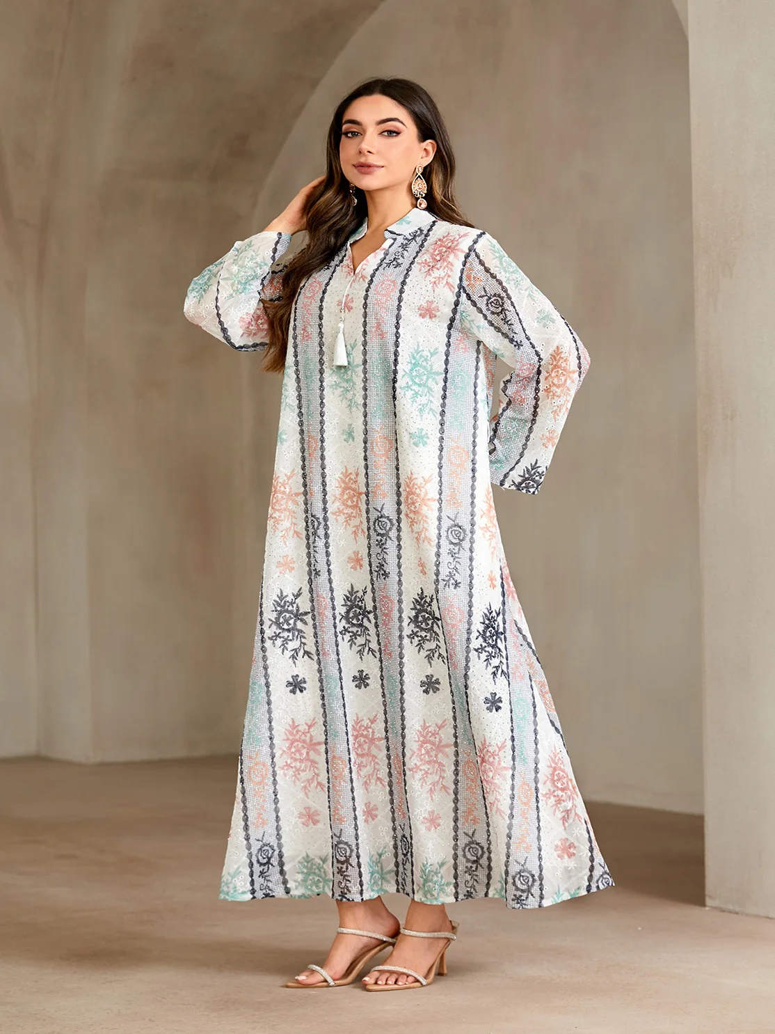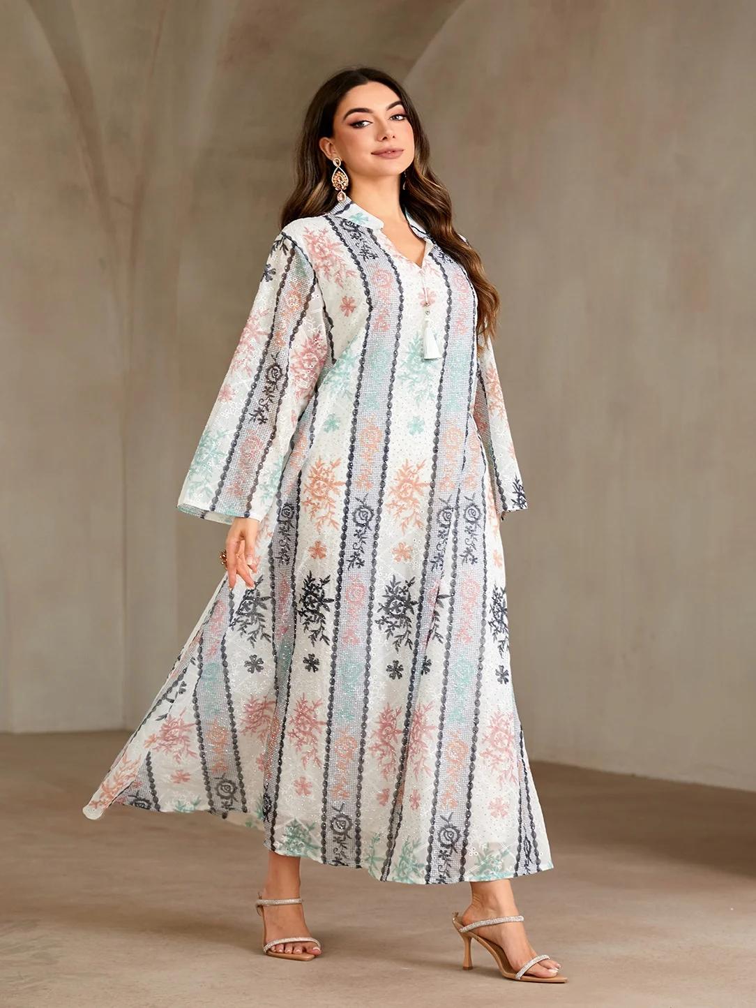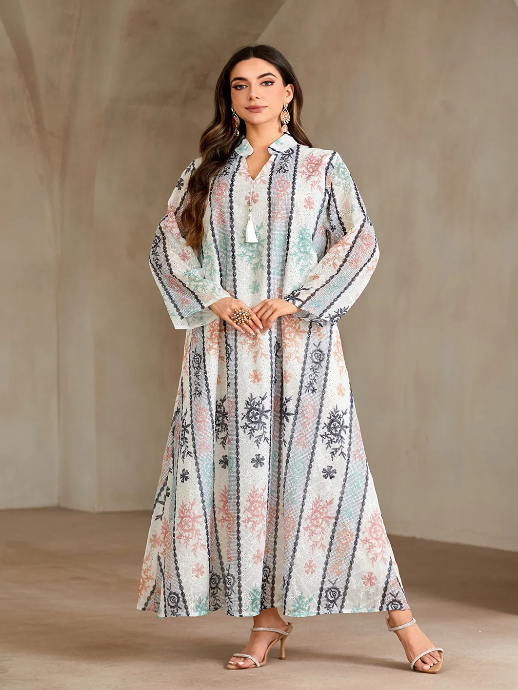 Wholesale New Style Muslim Robe Fashion Printed Hot Diamond V-neck Long Sleeve Dress