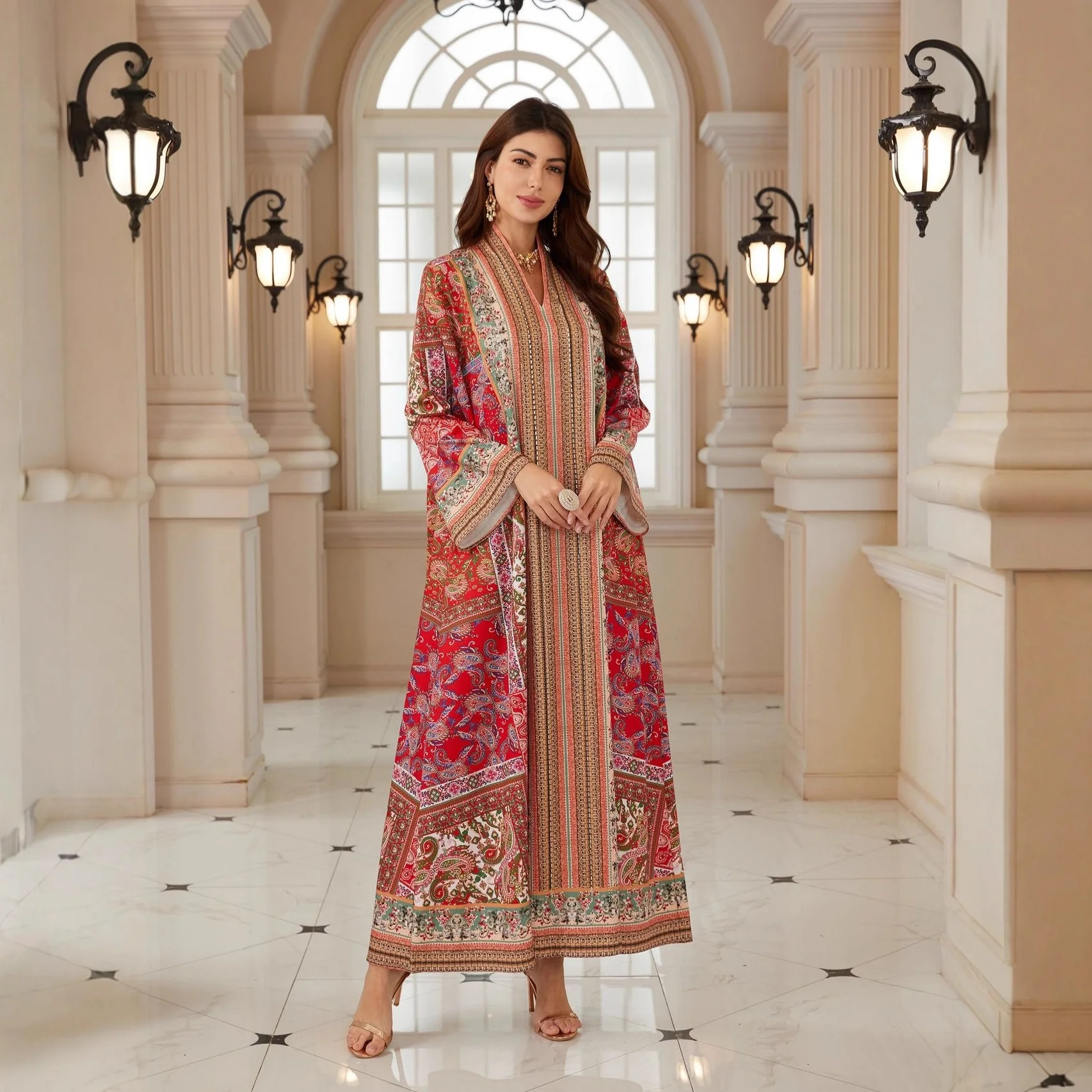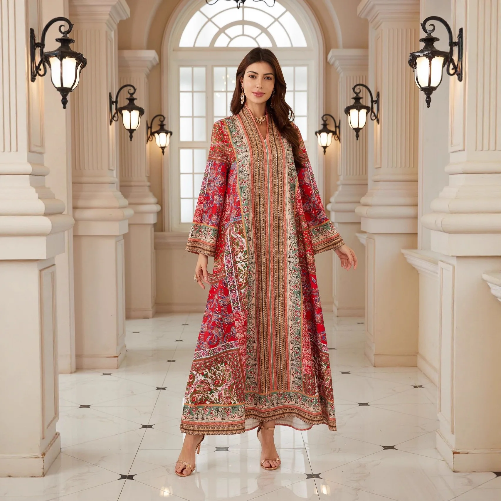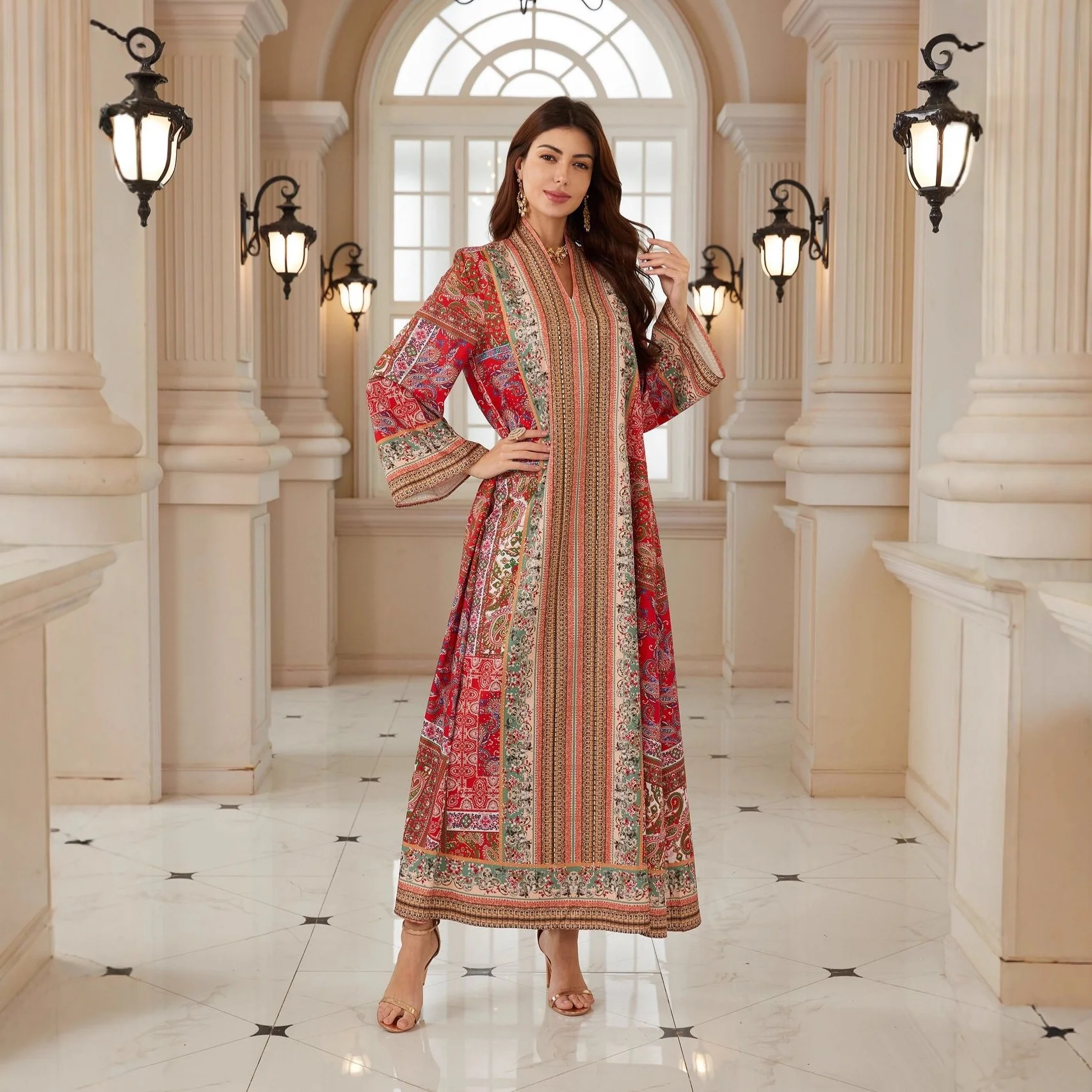Wholesale New Middle Eastern Muslim Women Robe Loose Printed Long Sleeve V-Neck Dress