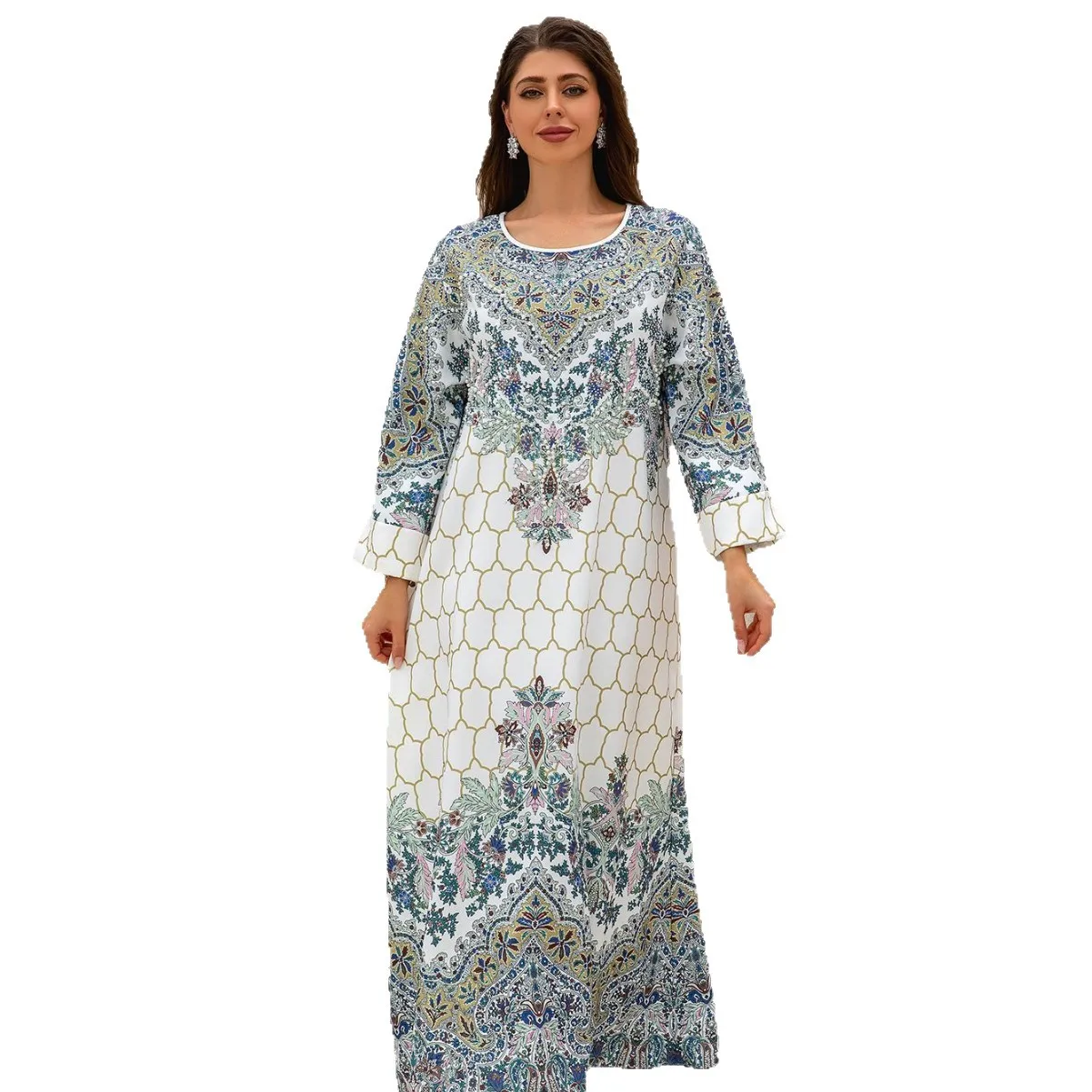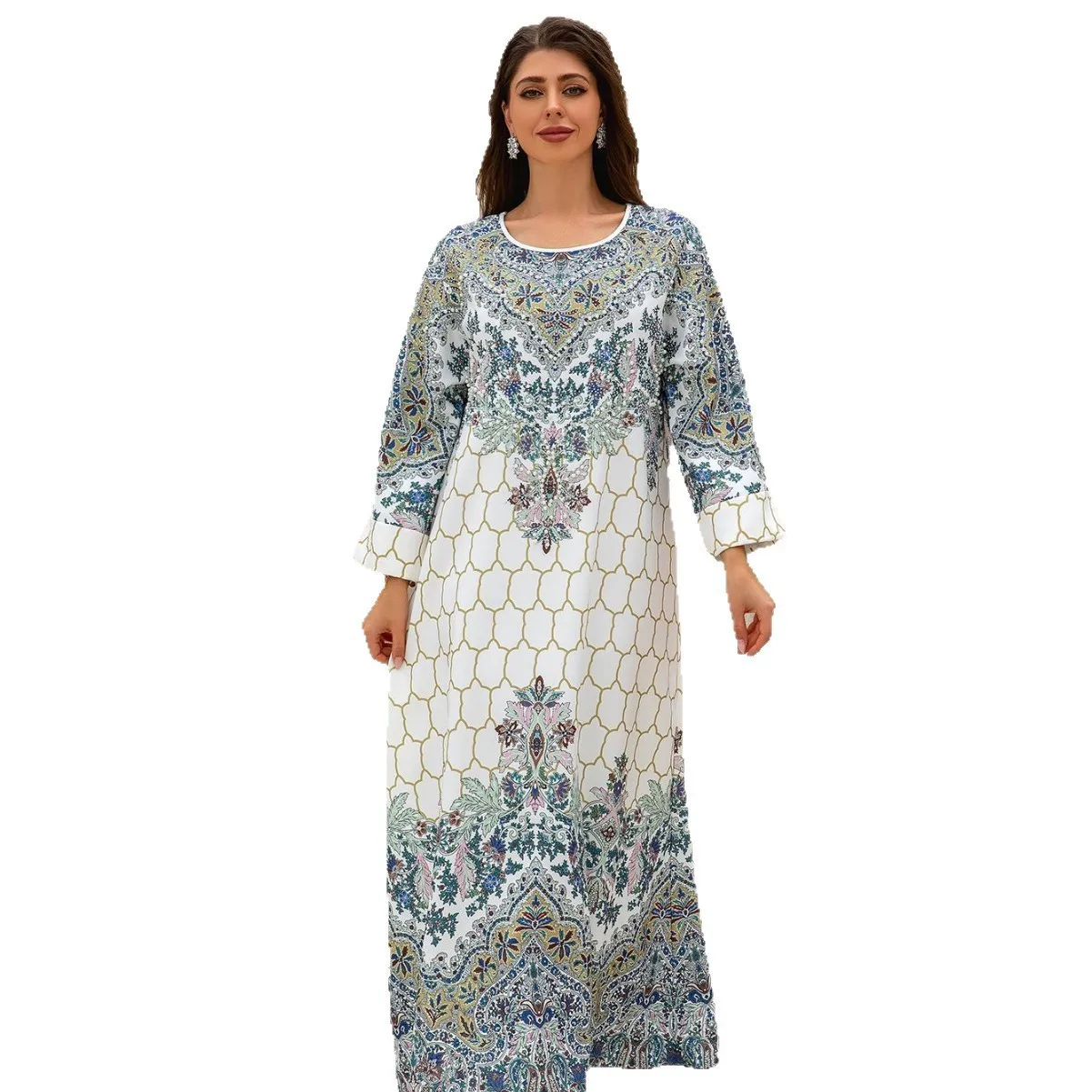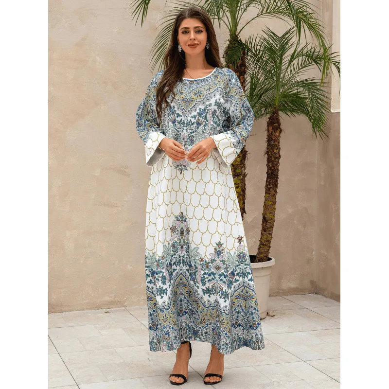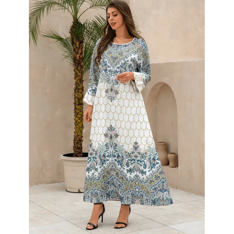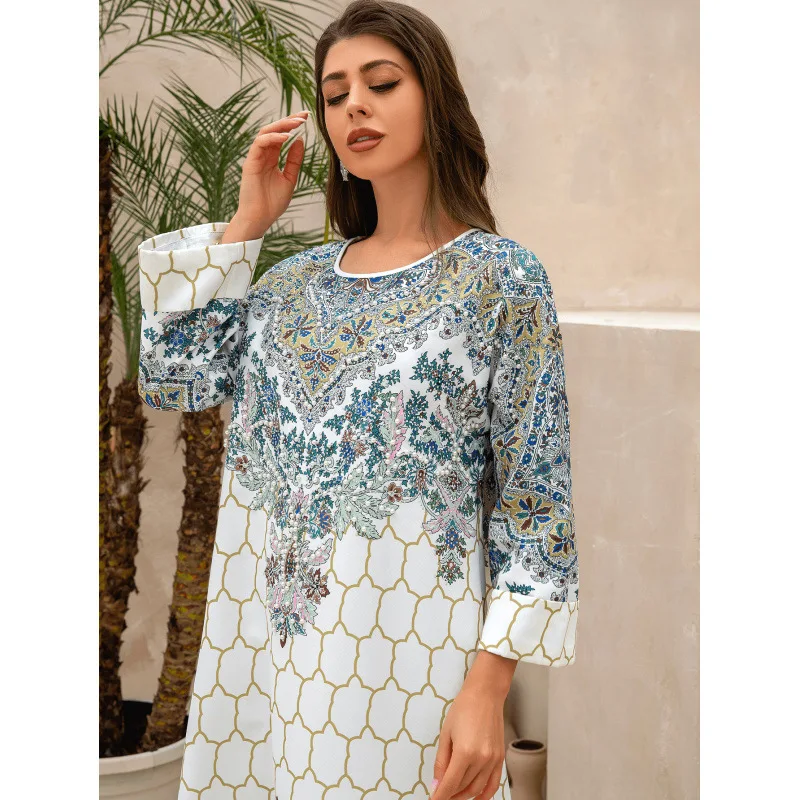 Wholesale New Middle Eastern Muslim Print Slim Long Sleeve Round Neck Robe Dress