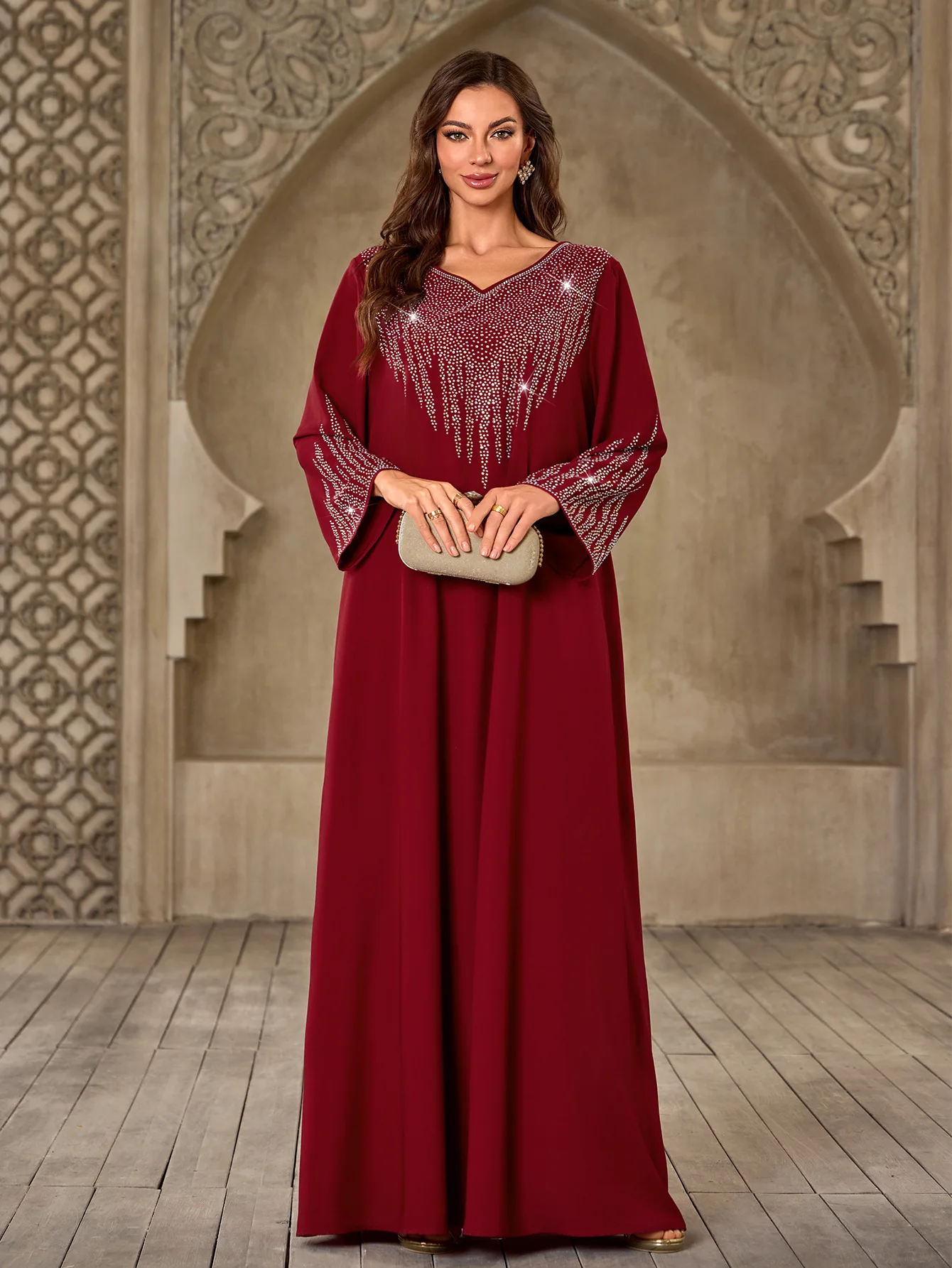 Wholesale New Middle East Women Fashion Rhinestone V-neck Casual Loose New Long Sleeve Dress