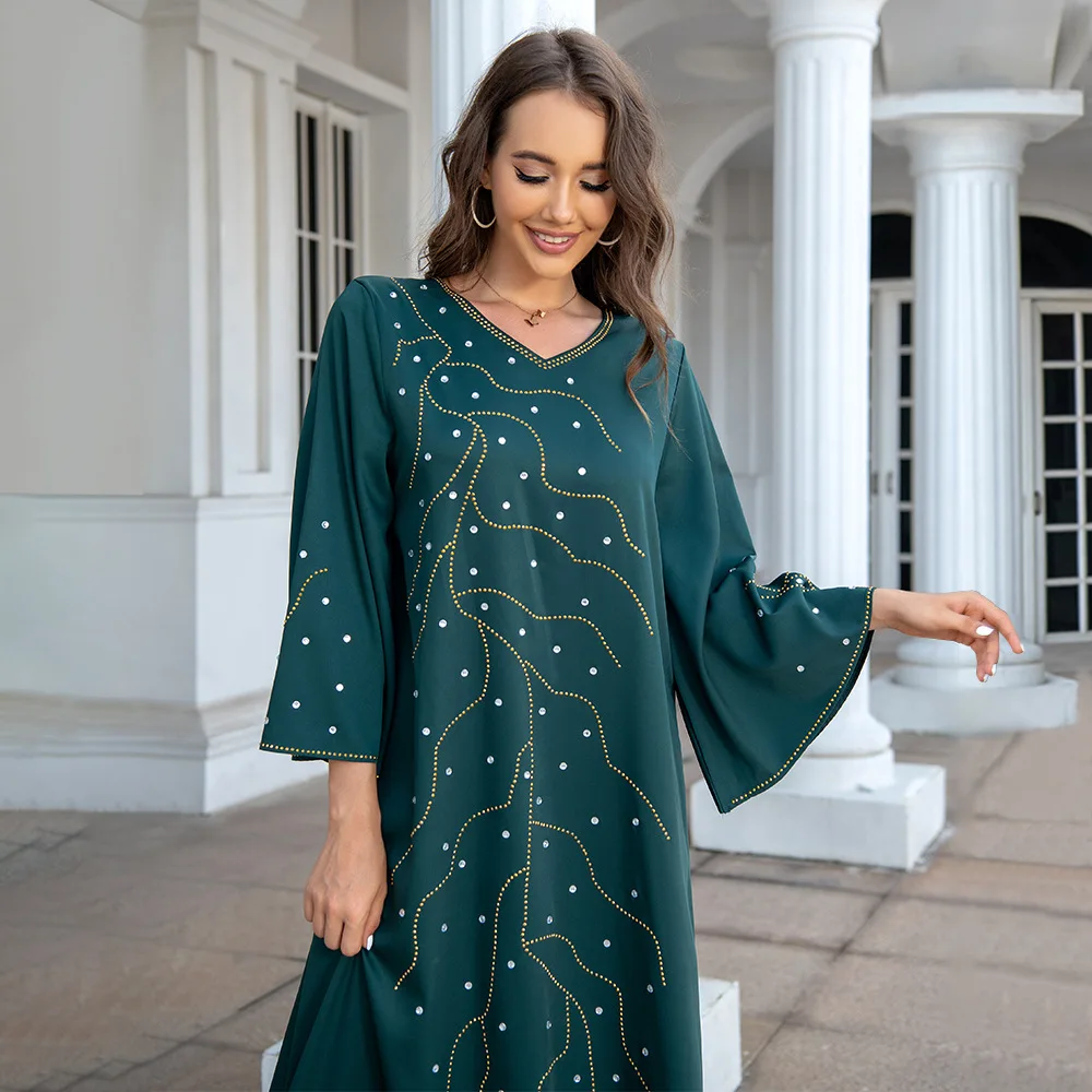 Wholesale New Middle Eastern Muslim Rhinestone Loose Robe Solid Color Long Sleeve Dress