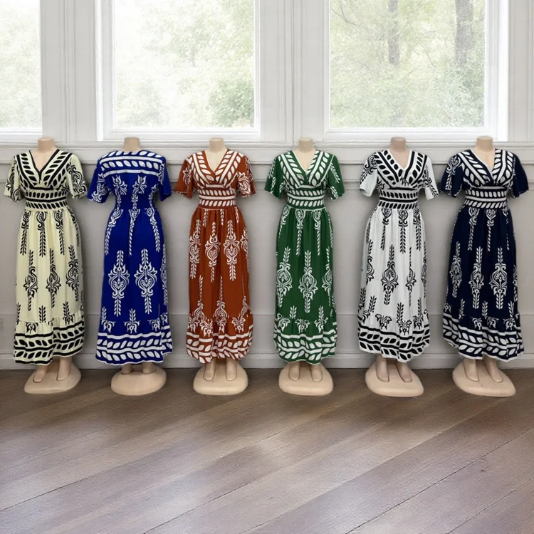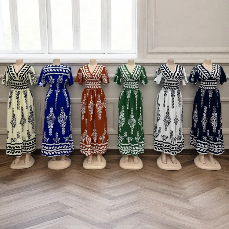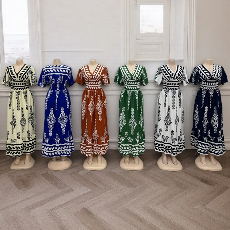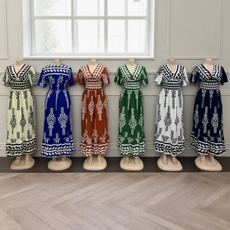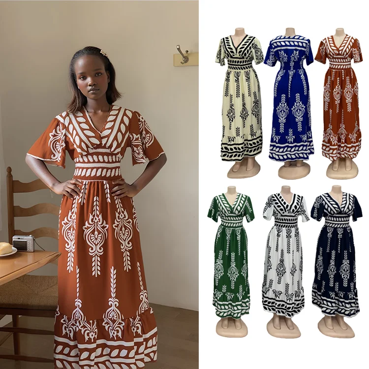 Wholesale New Vintage Women's V-neck Ruffled Elastic Waist Printed Short Sleeve Fashion Dress