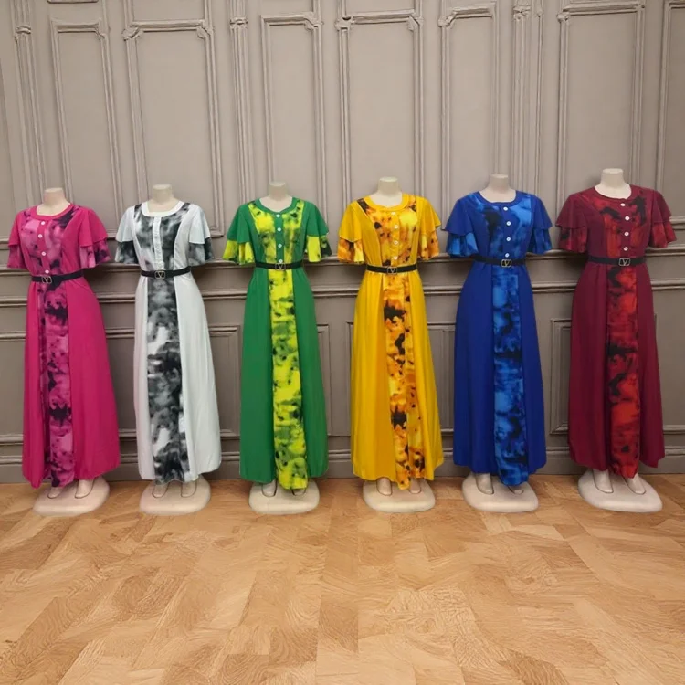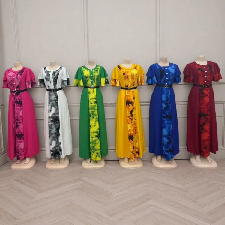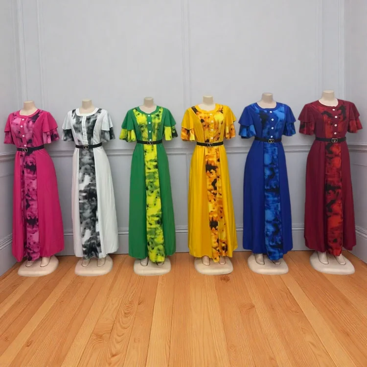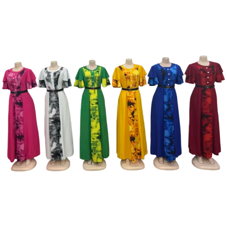 Wholesale New Summer Women's Elegant Printed Round Neck Belt Short Sleeve Dress